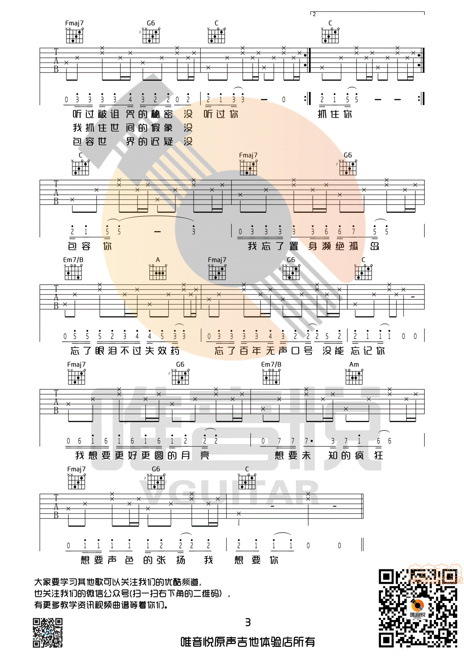 曲谱介绍: 奇妙能力歌《奇妙能力歌陈粒唯音悦制》吉他弹唱谱,采用C调指法编配原版,共有3张高清图谱。