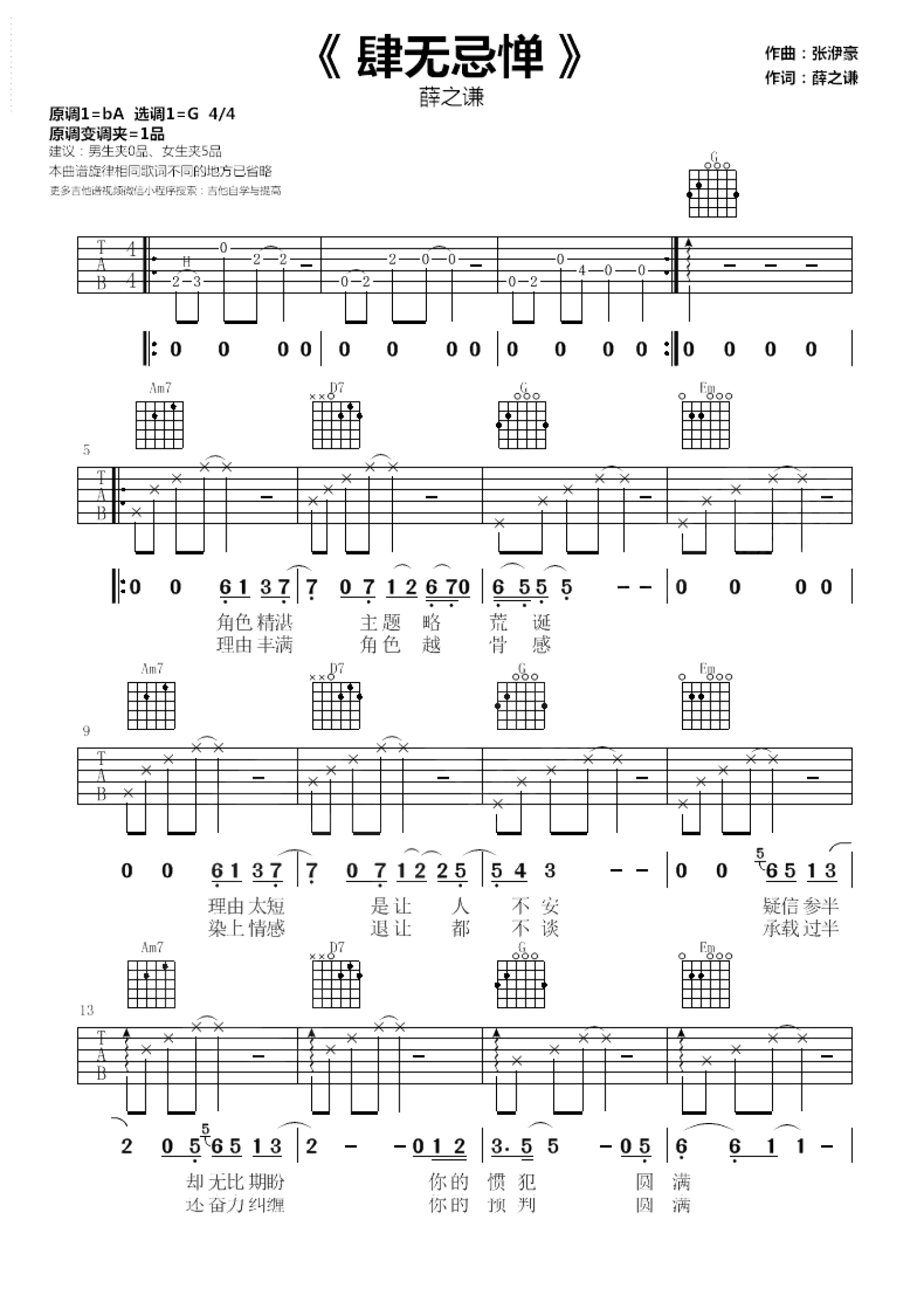 曲谱介绍: 肆无忌惮吉他谱,薛之谦的一首全新pop流行曲风情歌,G调指法编配,最后的离散,请用词温暖,薛之谦的词依旧一如既往的走心而深刻,精简临摹出爱情的本质,张ズ赖那吒腥玖Γ煲恢职朔瘴В婊呵崛嵋鞒銮楦惺澜绲牡雌鸱