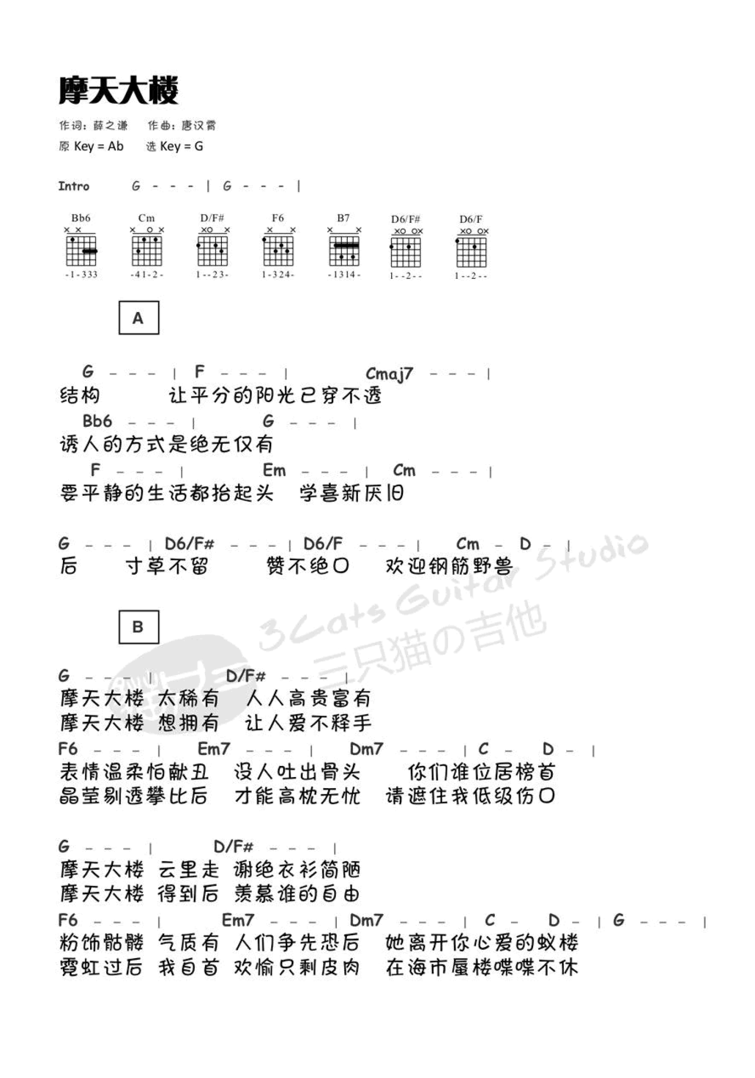 曲谱介绍: 摩天大楼吉他谱,薛之谦新歌,2018首支单曲全网首发,《摩天大楼》吉他谱,原调Ab,选调G调指法,瓦砾砂石,水泥钢筋,拔地而起的摩天楼宇,错节盘根展现这都市的魅力,高耸云霄看尽风光旖旎,灯红酒绿满眼纸醉金迷,渐浓的欲望迷失最初的本心。在这城市里,我们舔舐伤口感受孤独。