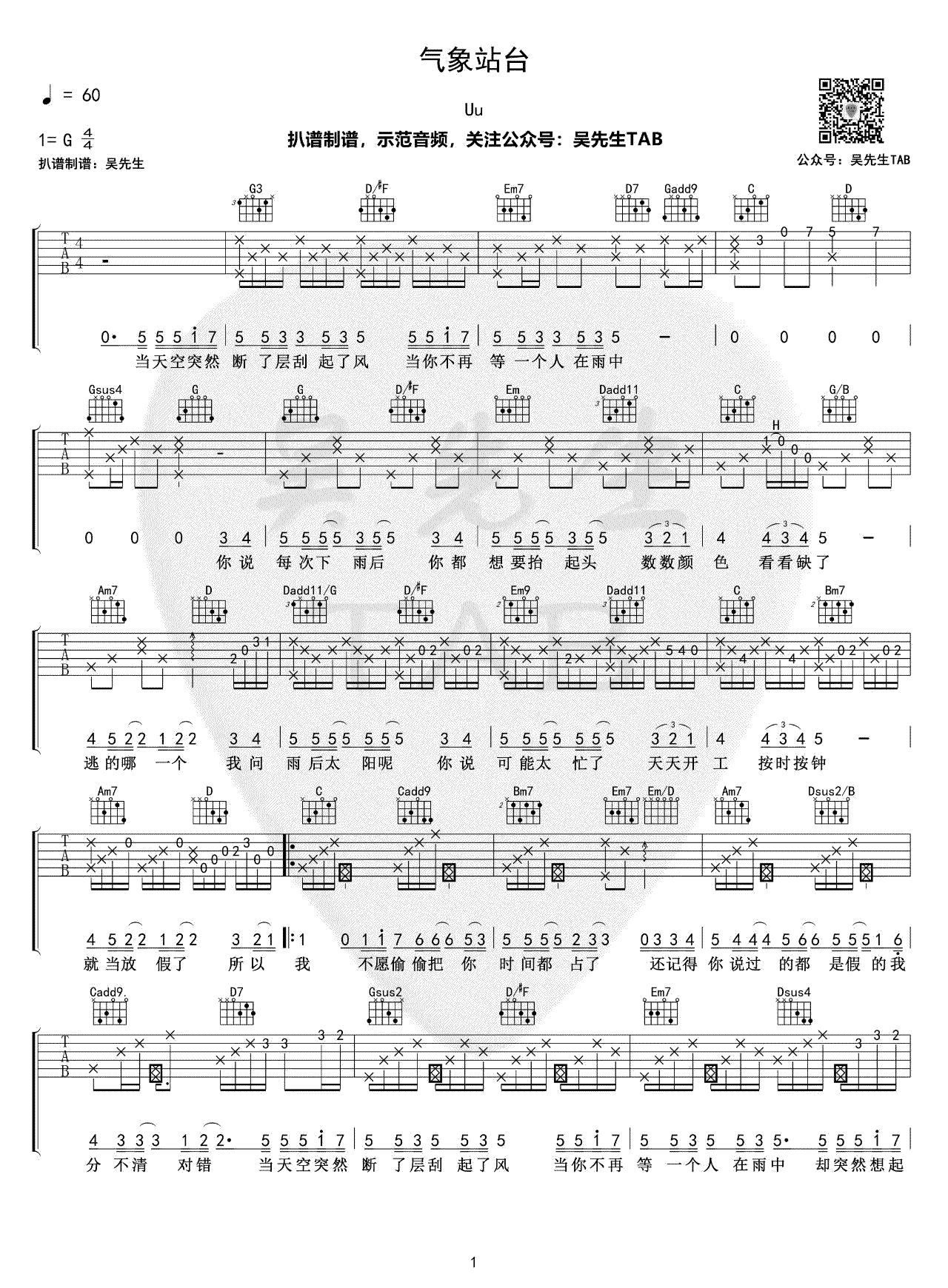 曲谱介绍: Uu《气象站台》吉他弹唱谱,共有3张高清图谱。