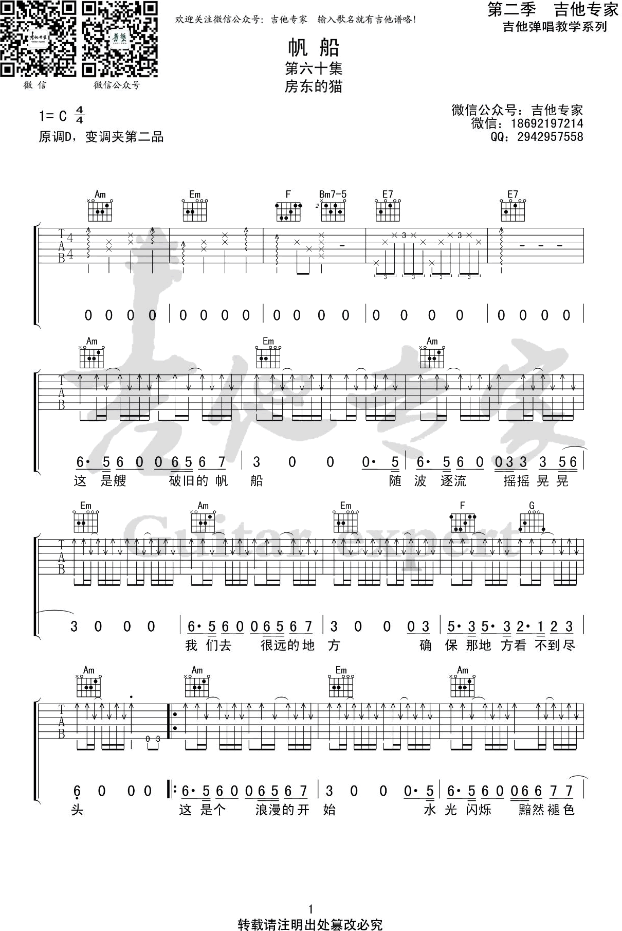曲谱介绍: 《帆船》,房东的猫在《我是唱作人2》节目中以这首歌曲最终胜出。帆船六线谱,原调D选调C,变调夹第二品,三张弹唱图片谱,吉他专家编配出品,琴谱网网更新分享。