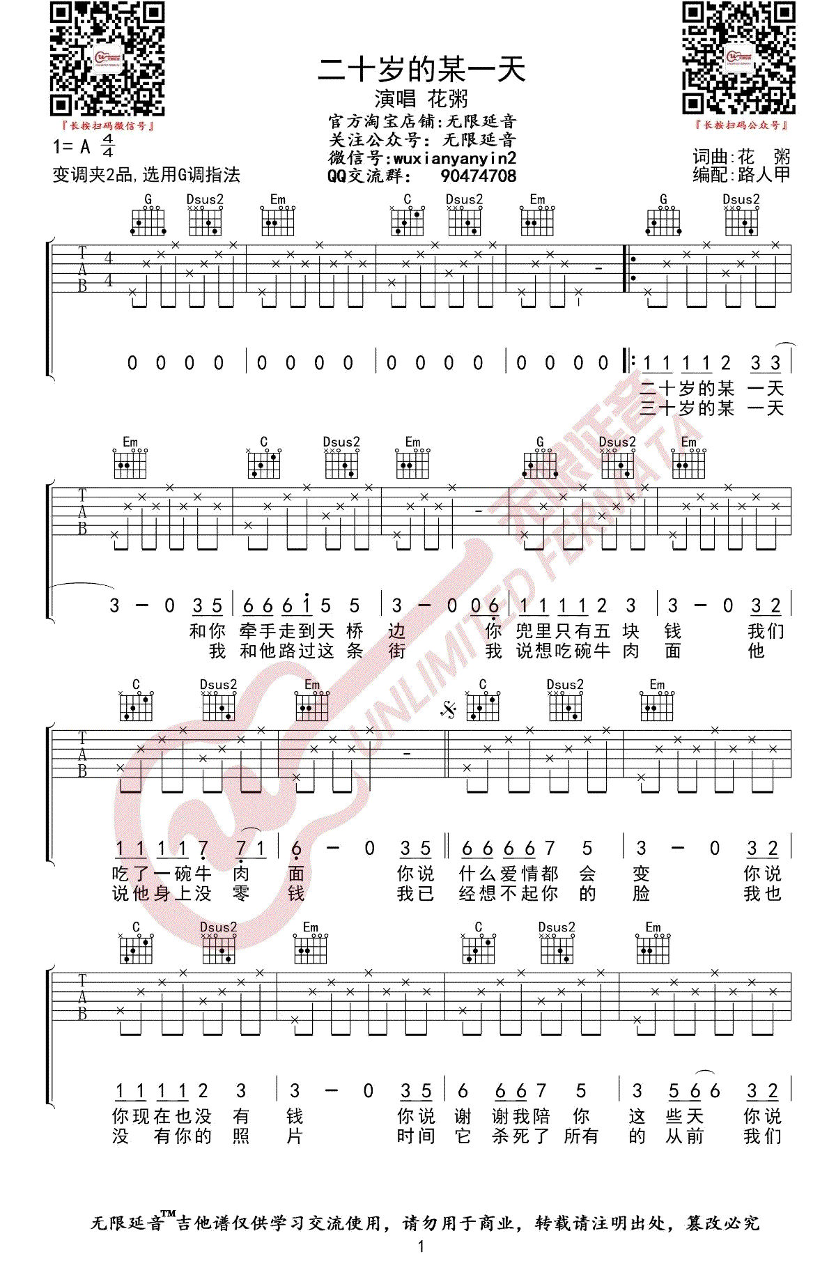 曲谱介绍: 《二十岁的某一天》,花粥演唱的一首原创民谣歌曲,20岁的某一天六线谱,选用G调指法,变调夹2品,两张弹唱图片谱。无限延音制谱分享,琴谱网网更新上传。 花粥的歌总是用简单的词语旋律表达美好而散漫的青春,既不是安河桥下清澈的水,也不是南山喃北秋悲,更没有奇妙能力,有的只是你我青春里那点没什么好说的破事儿。