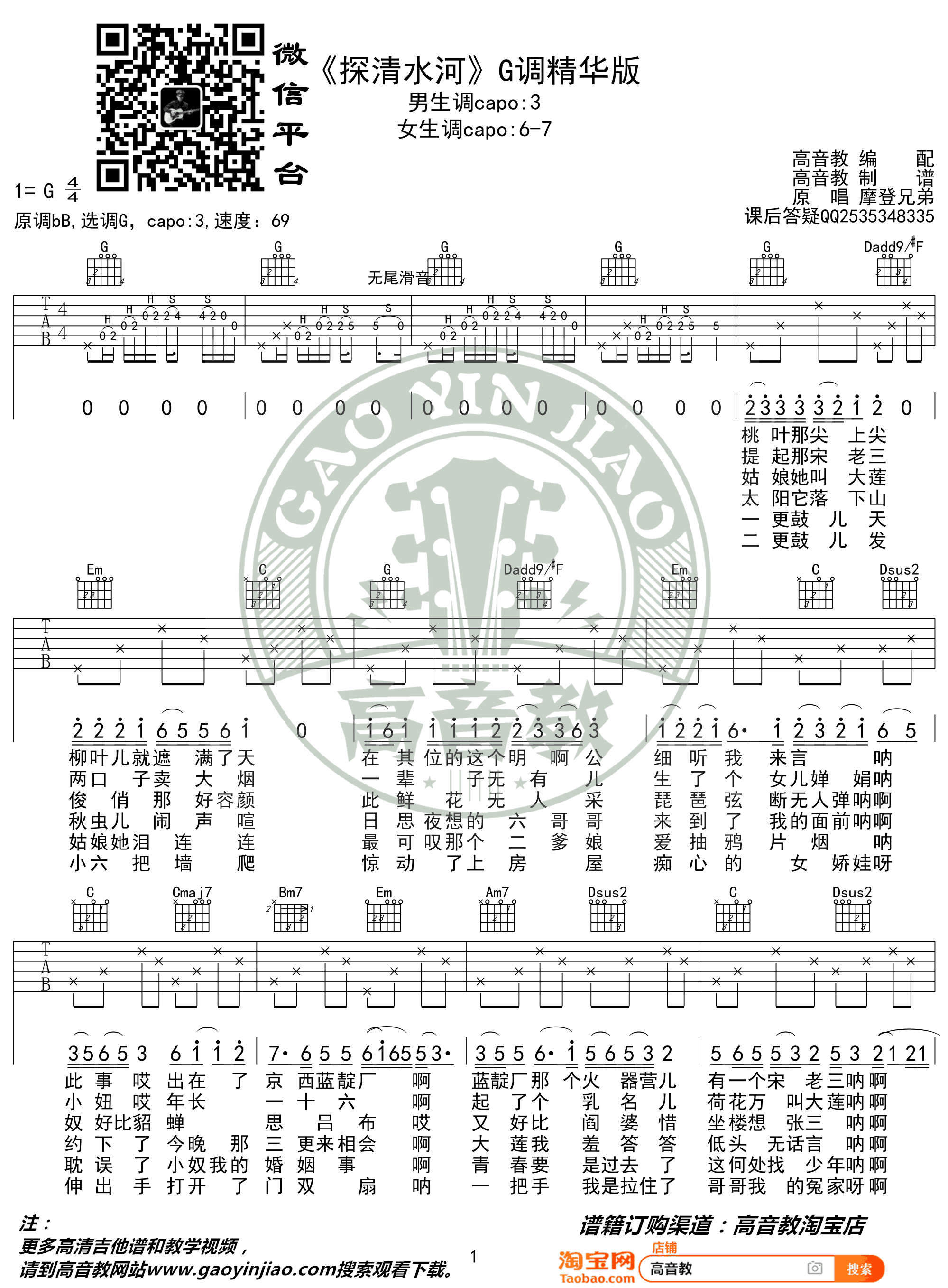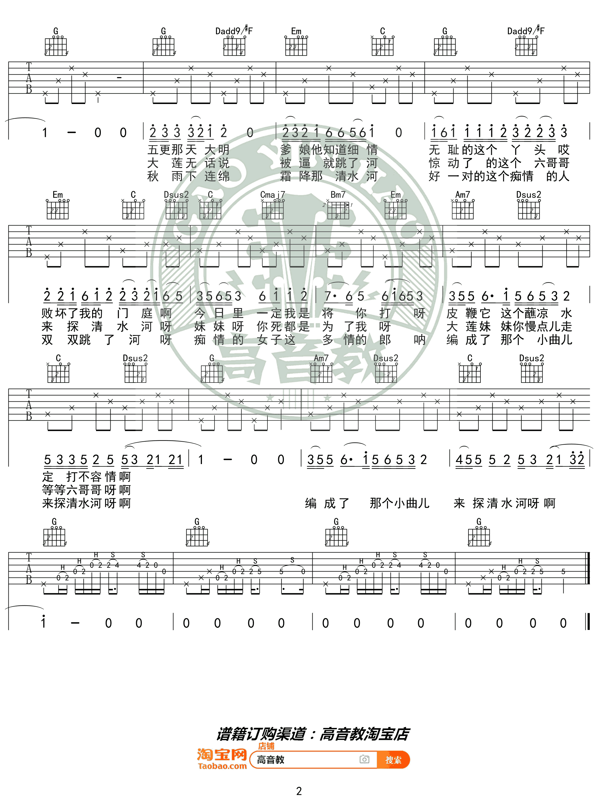 曲谱介绍: 张云雷《探清水河》,G调编配,变调夹夹第三品,一首曲调婉转旋律动听的京西小曲儿,探清水河六线谱,两张图片谱,高音教制谱出品,并同步送上教学视频,琴谱网网整理更新。 这首歌曲可以说是北京小曲小调的代表作,讲述一个类似梁祝的凄美爱情故事,在歌者的重新演绎下,戏曲唱腔和流行音乐完美结合,在穿越百余年之后,重新赋予更丰富的情感表达!