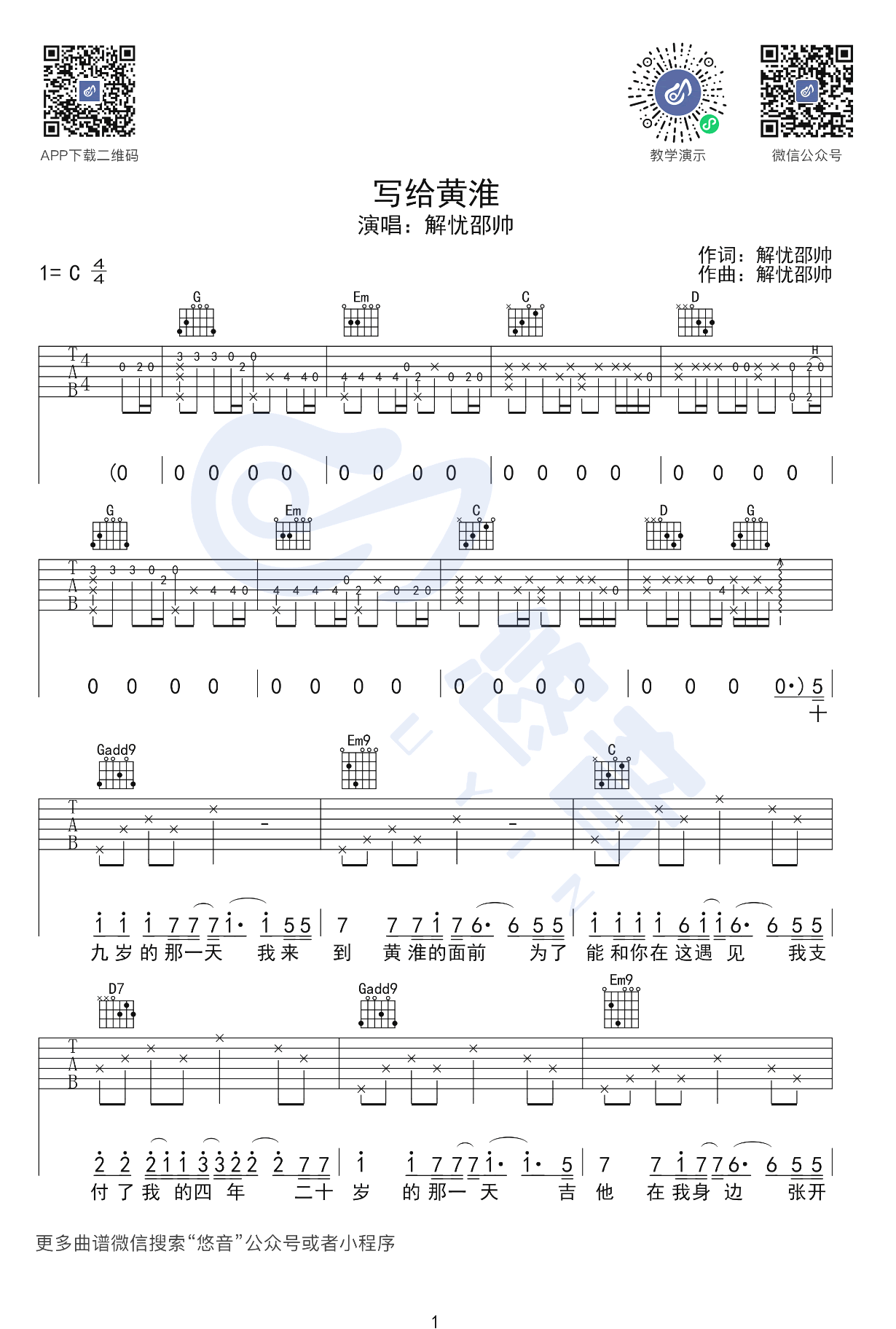 曲谱介绍: 解忧邵帅《写给黄淮C调》吉他弹唱谱,采用C调指法编配,共有4张高清图谱。