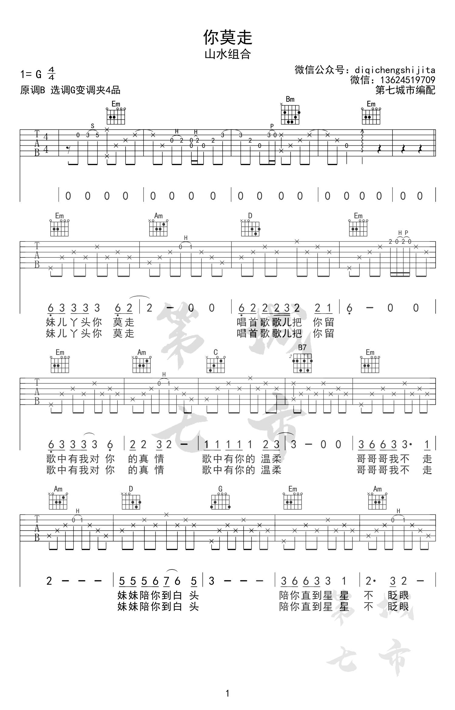 曲谱介绍: 《你莫走》,山水组合演唱的一首男女对唱歌曲,原调B,选调G,变调夹夹第四品。你莫走谱,两张高清图片六线谱。感谢第七城市编配制谱,琴谱网吉他网更新上传。 一首火爆全网,给人别样风味的原创山野民谣,男声沧桑粗犷,女声清澈甜美,朴实无华的歌词,加上朗朗上口的旋律,把人们深藏的质朴情感唤醒!