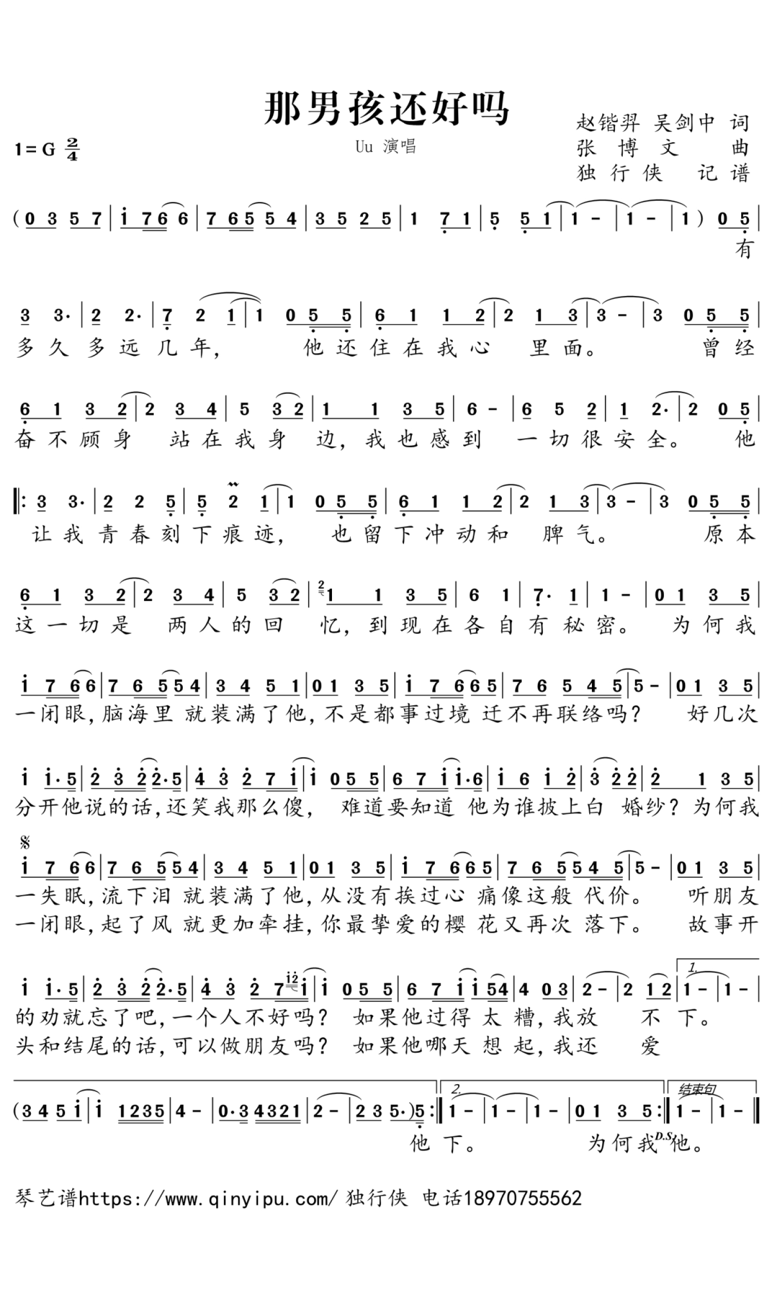 那男孩还好吗简谱 - Uu