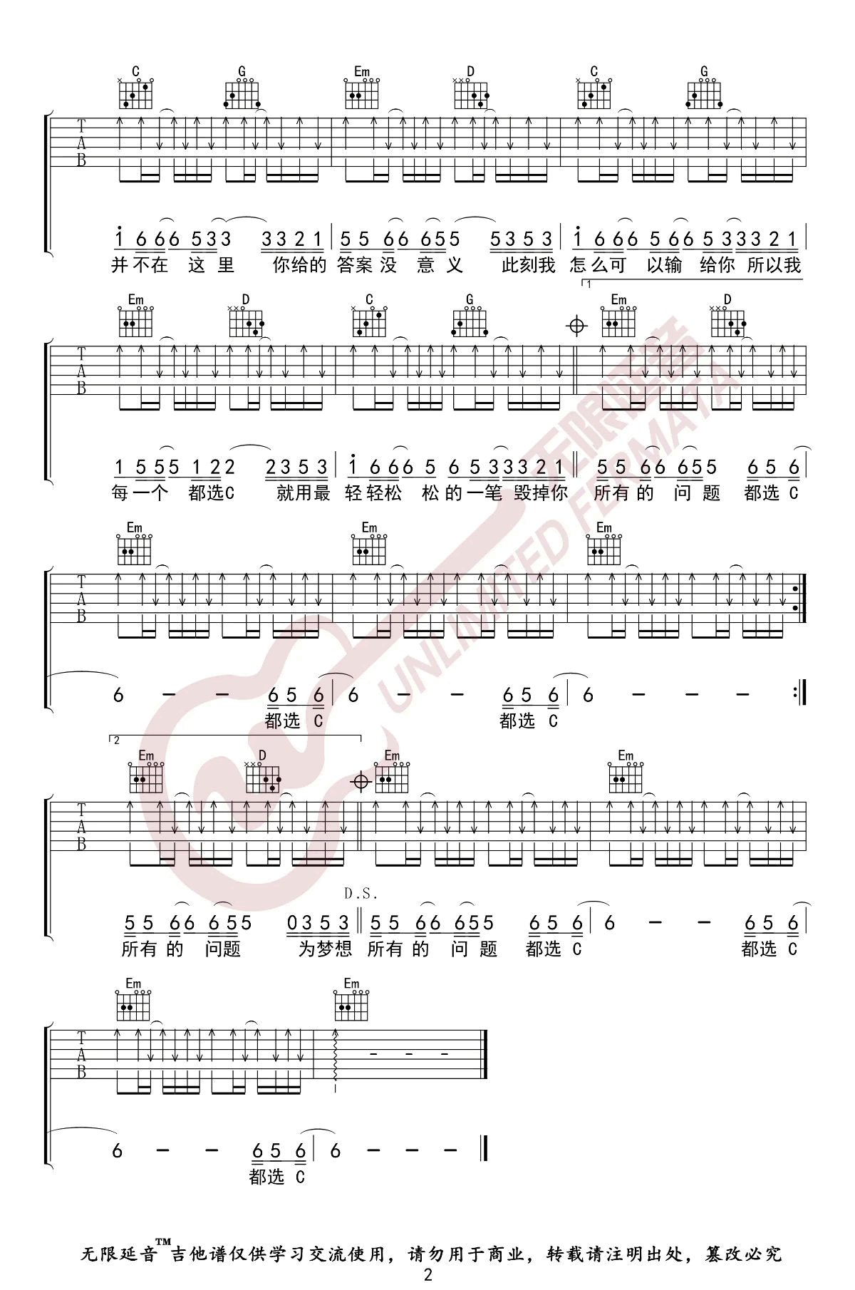 曲谱介绍: 《都选C》,电影《缝纫机乐队》推广曲,歌曲原调A,选用G调指法,变调夹夹2品。都选C六线谱,两张图片谱,无限延音编配出品,琴谱网网整理分享。 现实里会有很多左右为难的选择,有时除了自己,谁给的答案都没有意义。都选C,不是让你碰运气,而是鼓起勇气,落子不悔。