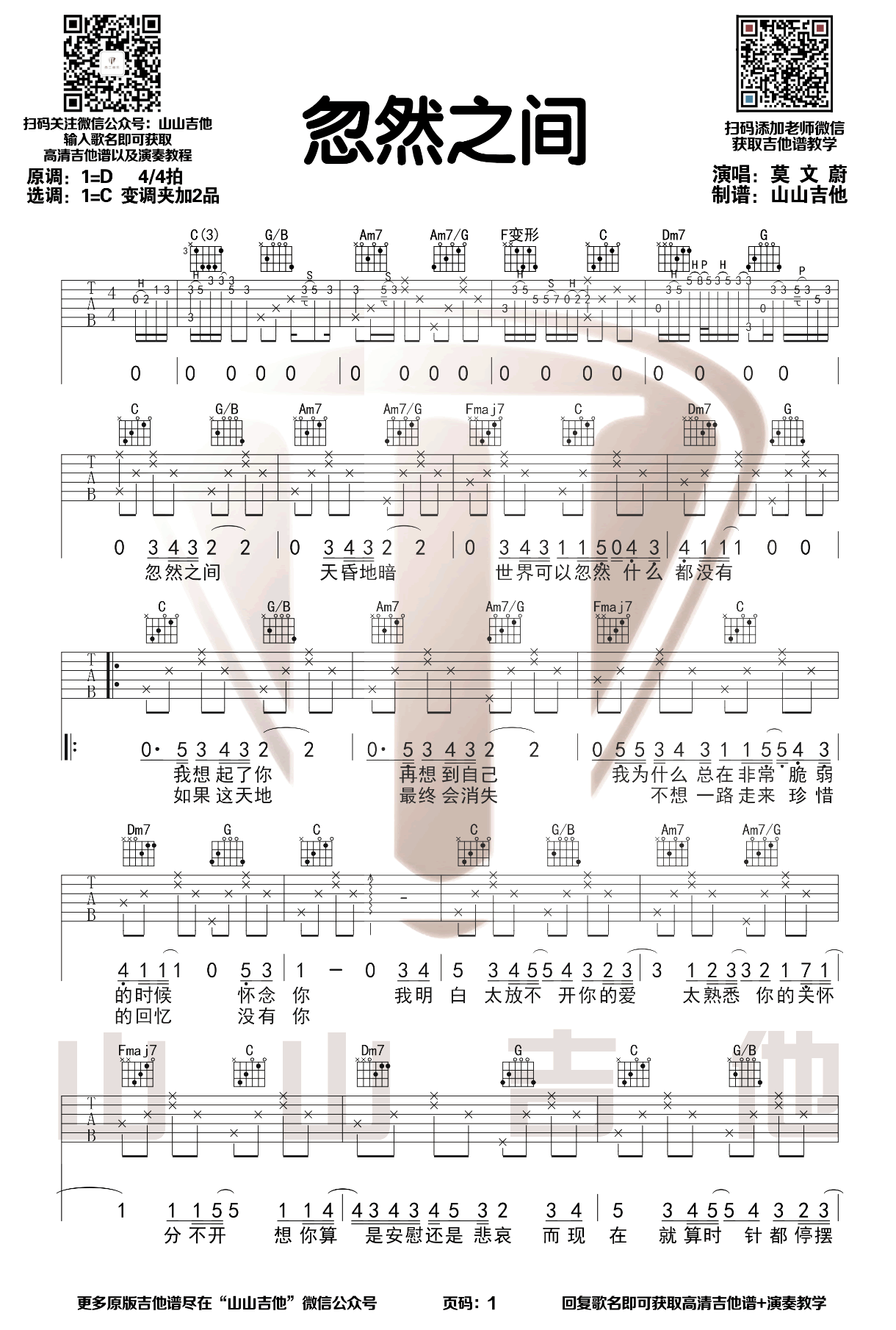 曲谱介绍: 忽然之间莫文蔚C调弹唱谱 忽然之间C调简单版莫文蔚入门弹唱谱 忽然之间 莫文蔚 G调弹唱谱 吉他教学视频 忽然之间TankG调弹唱谱图片谱 忽然之间李霖Gary版本莫文蔚视频