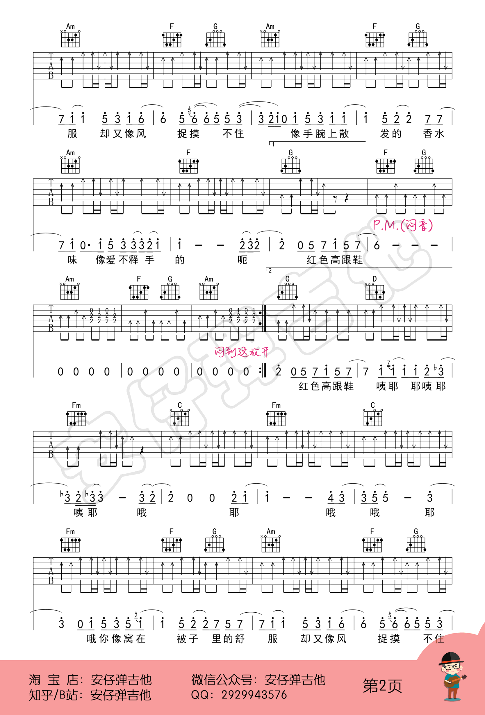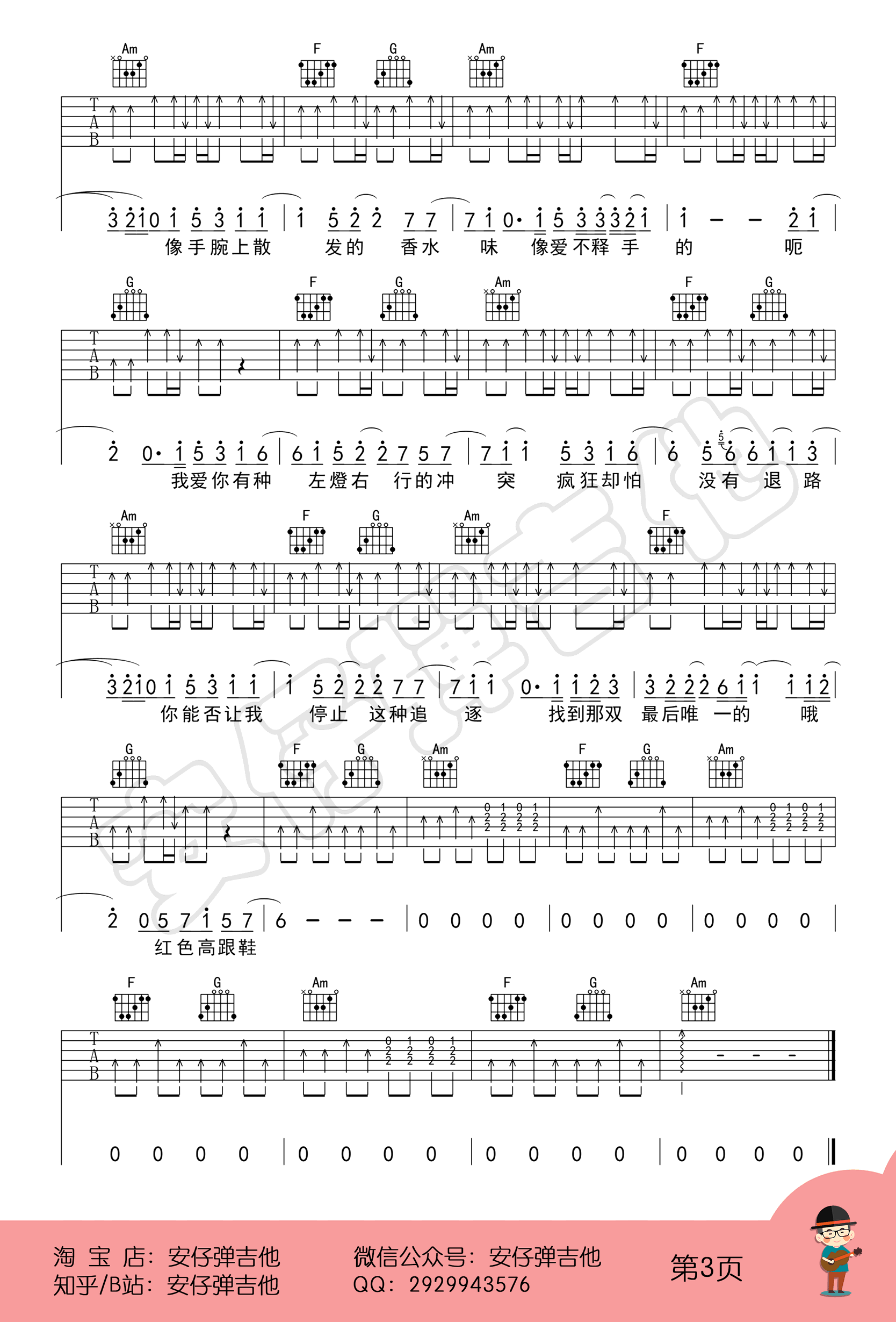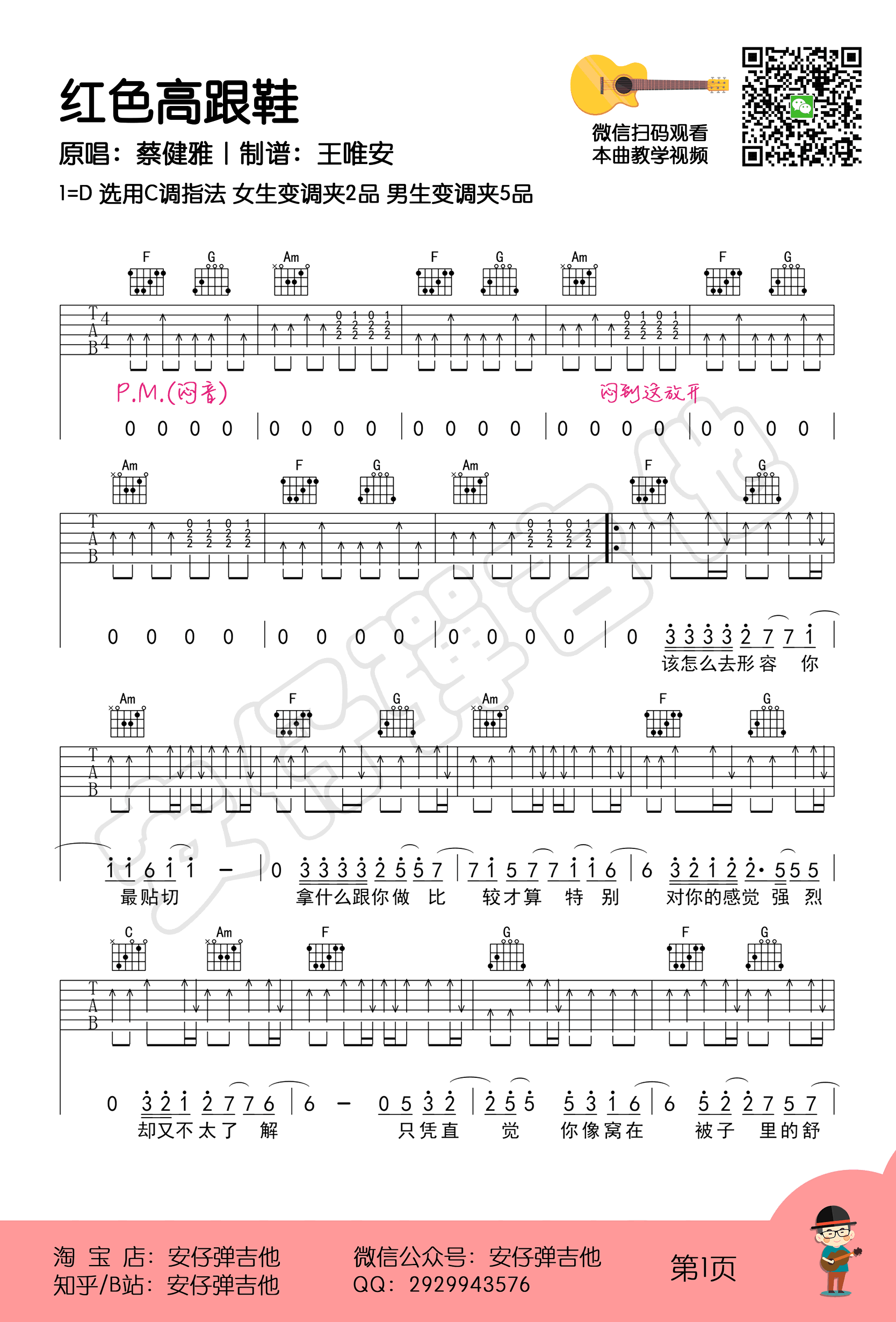曲谱介绍: 蔡健雅《红色高跟鞋》,选用C调指法,女生变调夹夹二品,男生变调夹夹五品。红色高跟鞋六线谱,三张高清图片谱,安仔弹吉他编配出品,琴谱网网上传。 和声分析 主要和声进行:456。如果你掌握了和声进行的规律,记忆就像记一个一个短语词组一样,很容易记的,这首歌只要记得主要456,第3句4516,进副歌之前从5级进,记这三点就好了。