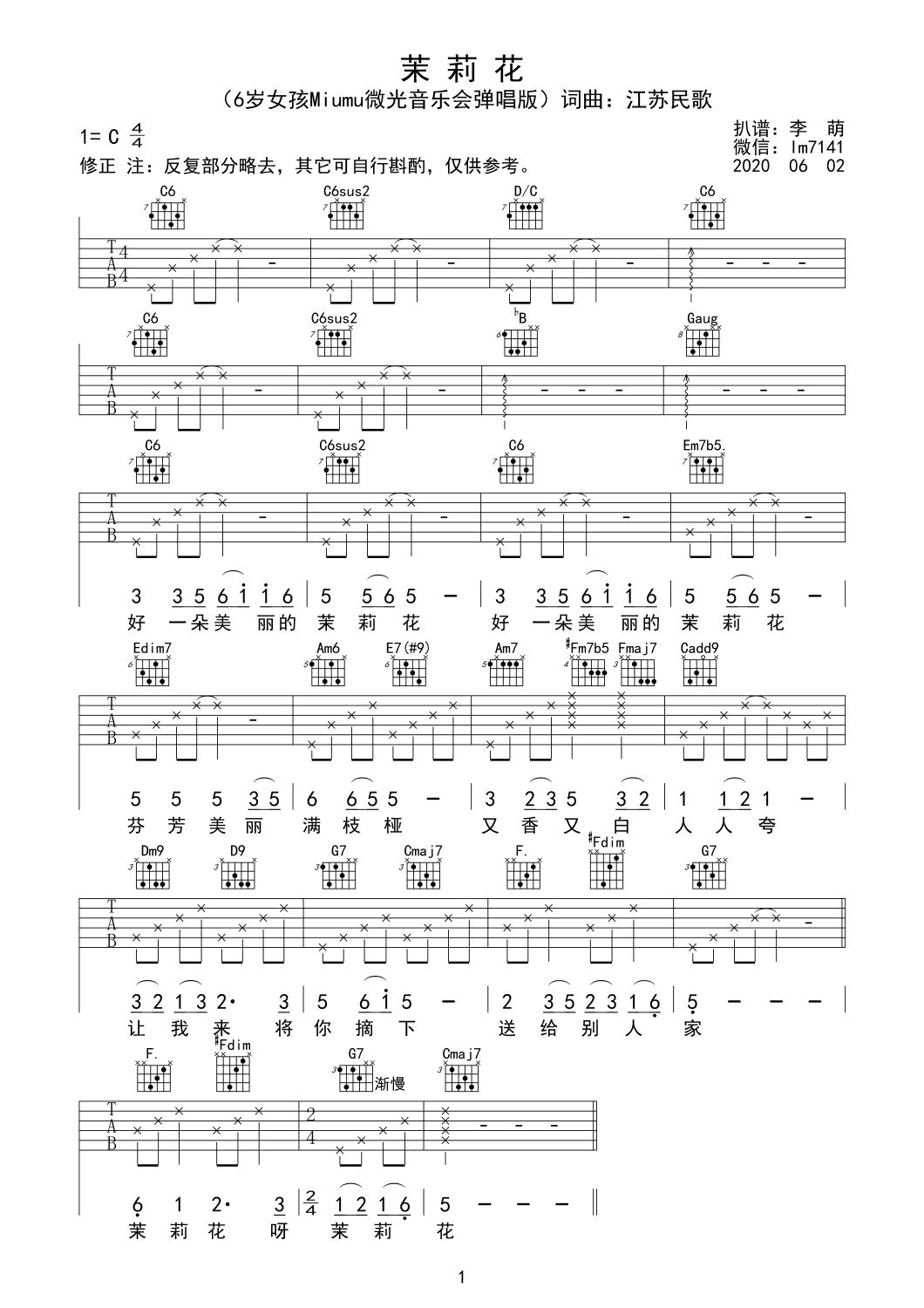 曲谱介绍: 茉莉花,六岁女孩Miumiu在微光音乐会的弹唱版,茉莉花六线谱,C调和弦编配,曲谱中反复部分略去,其他可以自行斟酌,仅供参考。感谢@李萌扒谱,琴谱网网上传。 凭借一首《Fly me to the moon》火遍世界的6岁南京吉他小女孩Miumiu,为大家带来自己家乡的民歌《茉莉花》。让我们和Miumiu一起,点击助力困境儿童 。