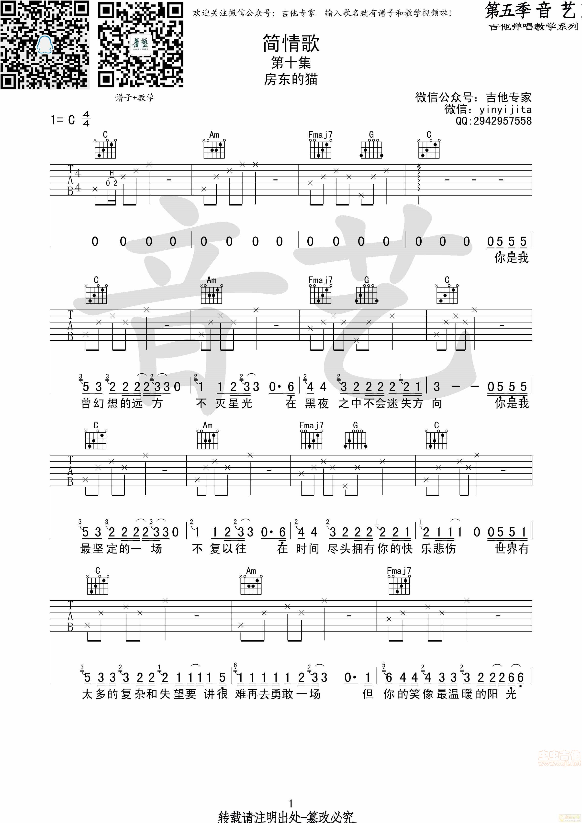 曲谱介绍: 简情歌《简情歌房东的猫原版》吉他弹唱谱原版,共有3张高清图谱。