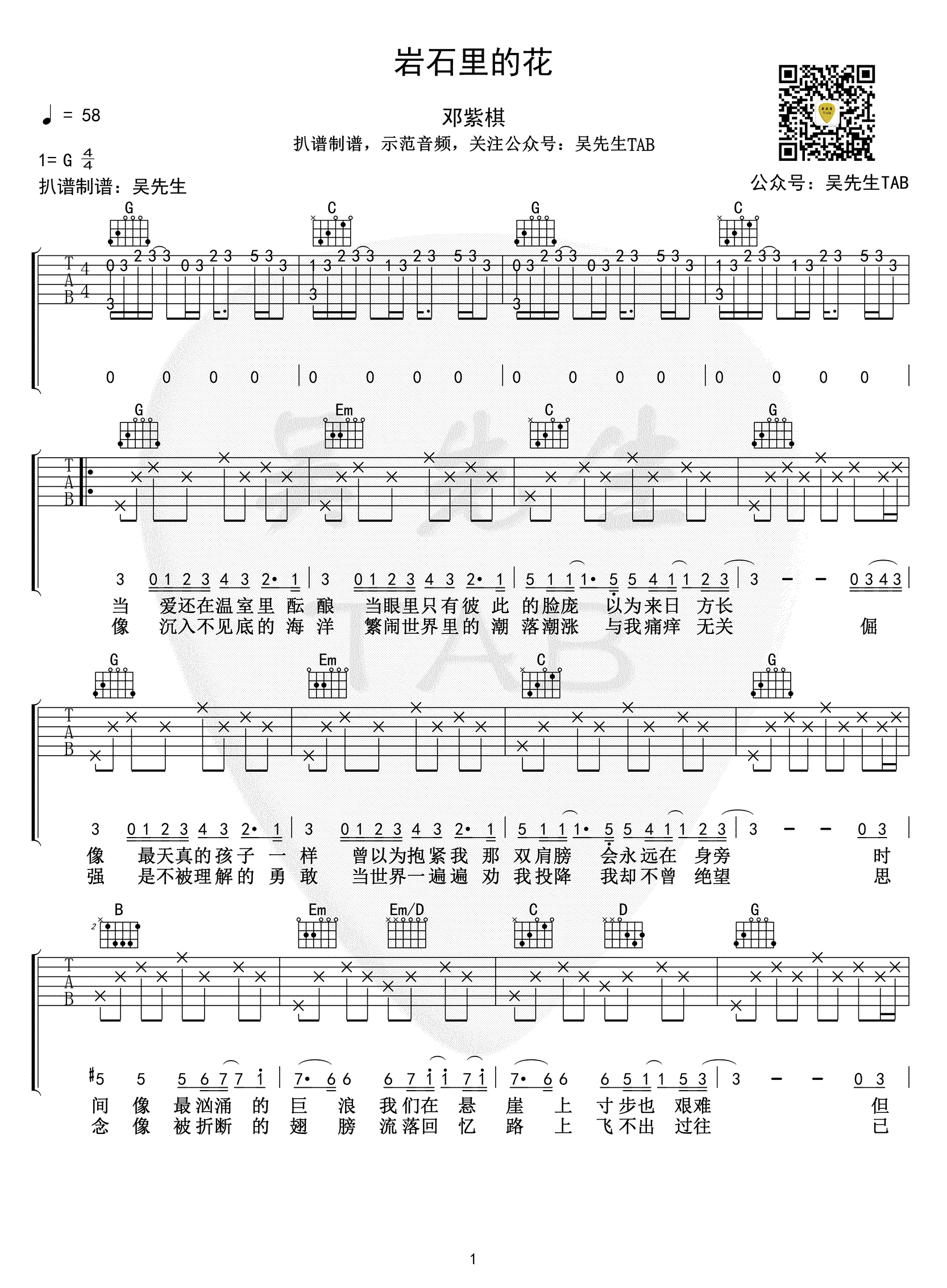 曲谱介绍: 《岩石里的花》,邓紫棋演唱,G调弹唱谱,完整版共四张高清图片,吴先生扒谱制谱,琴谱网网上传更新。