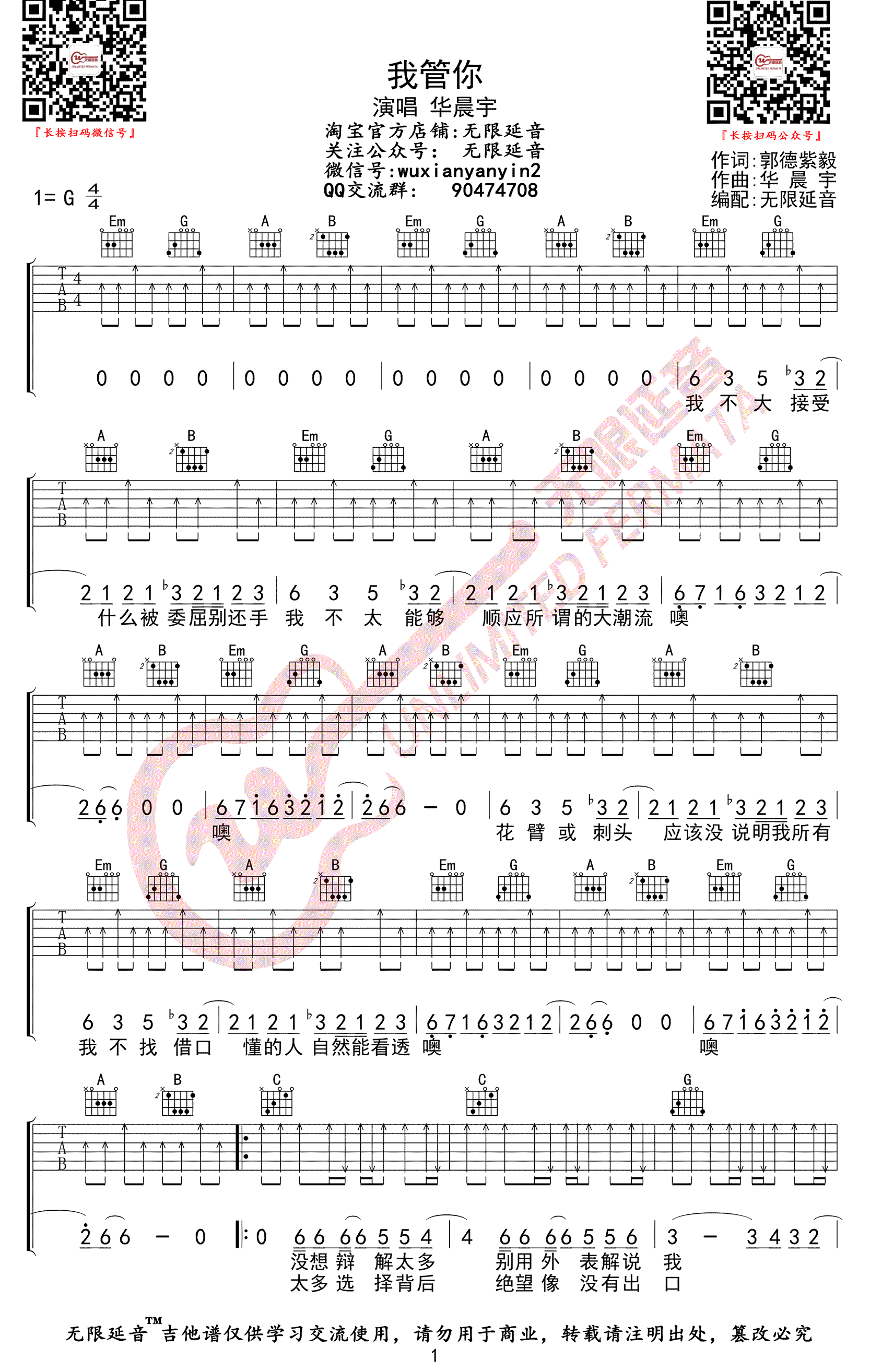 曲谱介绍: 华晨宇《我管你》,充满叛逆痞气的,我管你六线谱,G调,三张弹唱图片谱。无限延音编配制谱,琴谱网网更新上传。 一首只看歌词就很爽的歌,面对各种非议,要以一种我管你的态度去面对,别太多在意别人的看法。歌曲充分体现出90后率真个性。