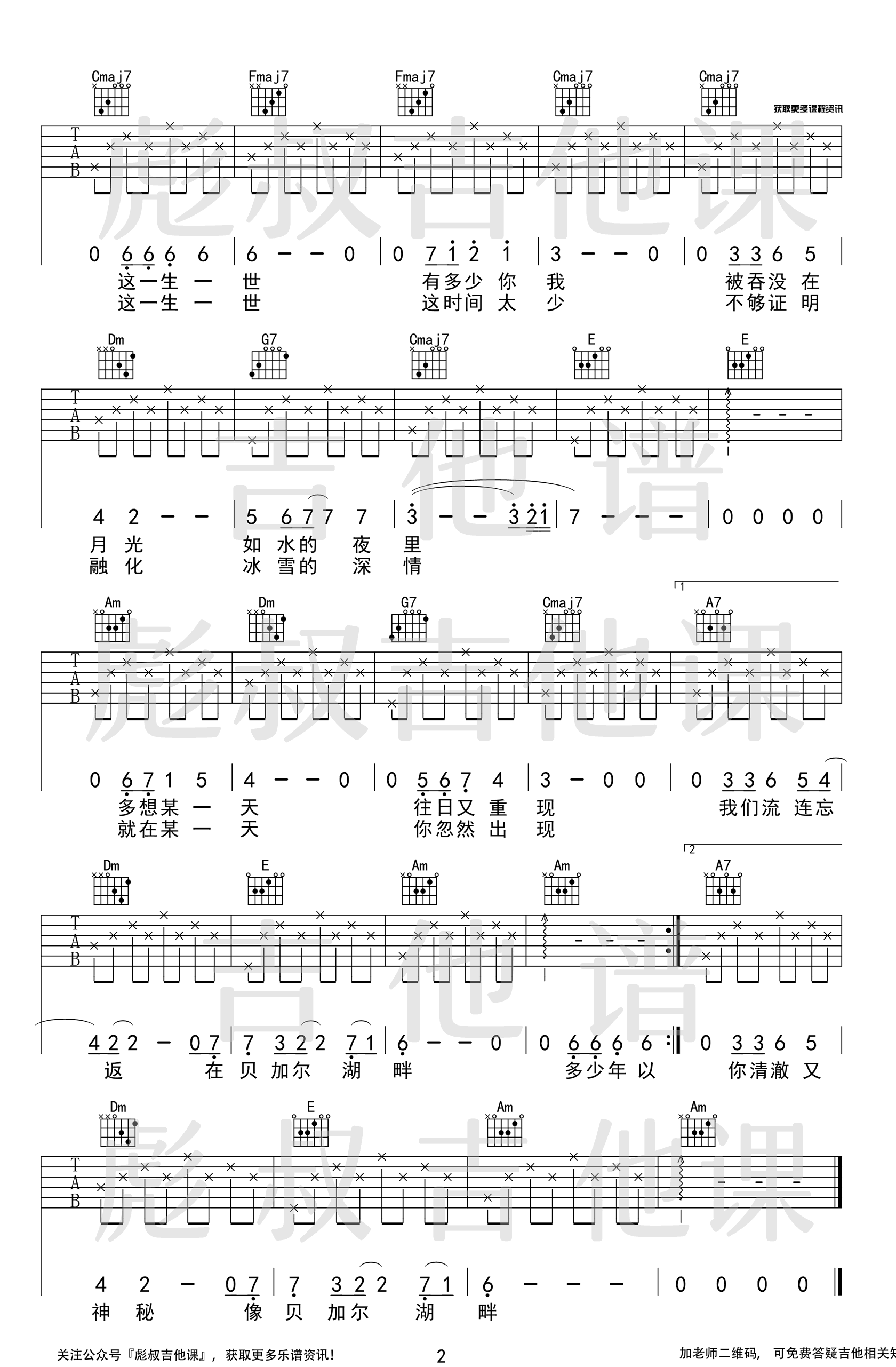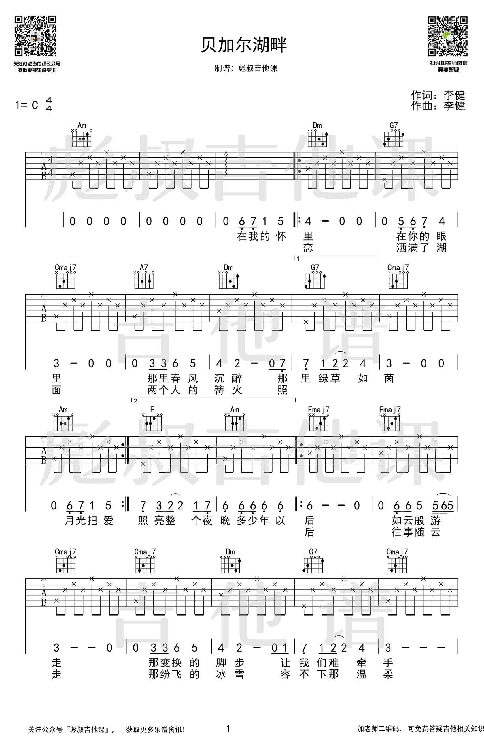 曲谱介绍: 《贝加尔湖畔》,李健的一首经典代表作品,贝加尔湖畔六线谱,C调弹唱谱,两张高清图片谱,彪叔吉他课编配,琴谱网网更新上传。 一首带有俄罗斯风格的民谣歌曲,悠扬空灵的歌声温暖动听,将我们带入唯美的意境,让人仿佛置身于一场浪漫的故事。李健的声音清亮而充满质感,空灵飘逸地将贝加尔的宁静演绎的淋漓尽致。