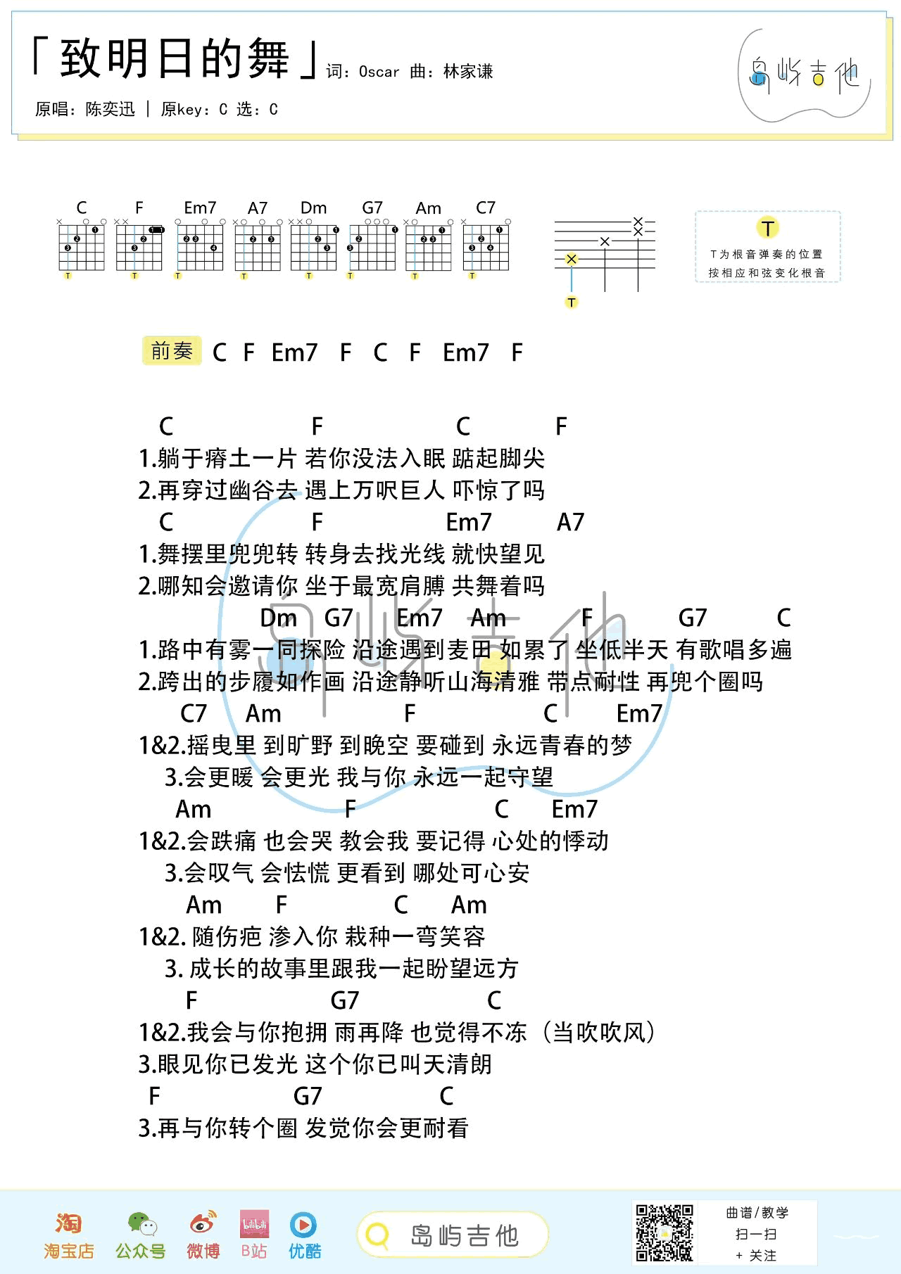 曲谱介绍: 陈奕迅《致明日的舞》吉他弹唱谱,共有1张高清图谱,免翻页排版设计。