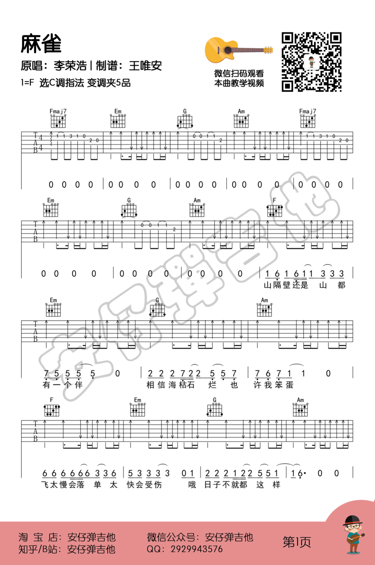 曲谱介绍: 麻雀,李荣浩的一首励志歌曲,麻雀六线谱,选用C调指法,变调夹五品为F原调音高。共四张图片,感谢安仔弹吉他编配,并送上配套示范和教学,琴谱网网更新分享。 一首写给每个普通人的歌曲,麻雀虽小,却也有属于自己的天空,也有着期待的美好,哪怕经历风雨,也要努力追寻自己的明天!希望平凡如你我为生活奋斗的人,都不要放弃自己的梦想!