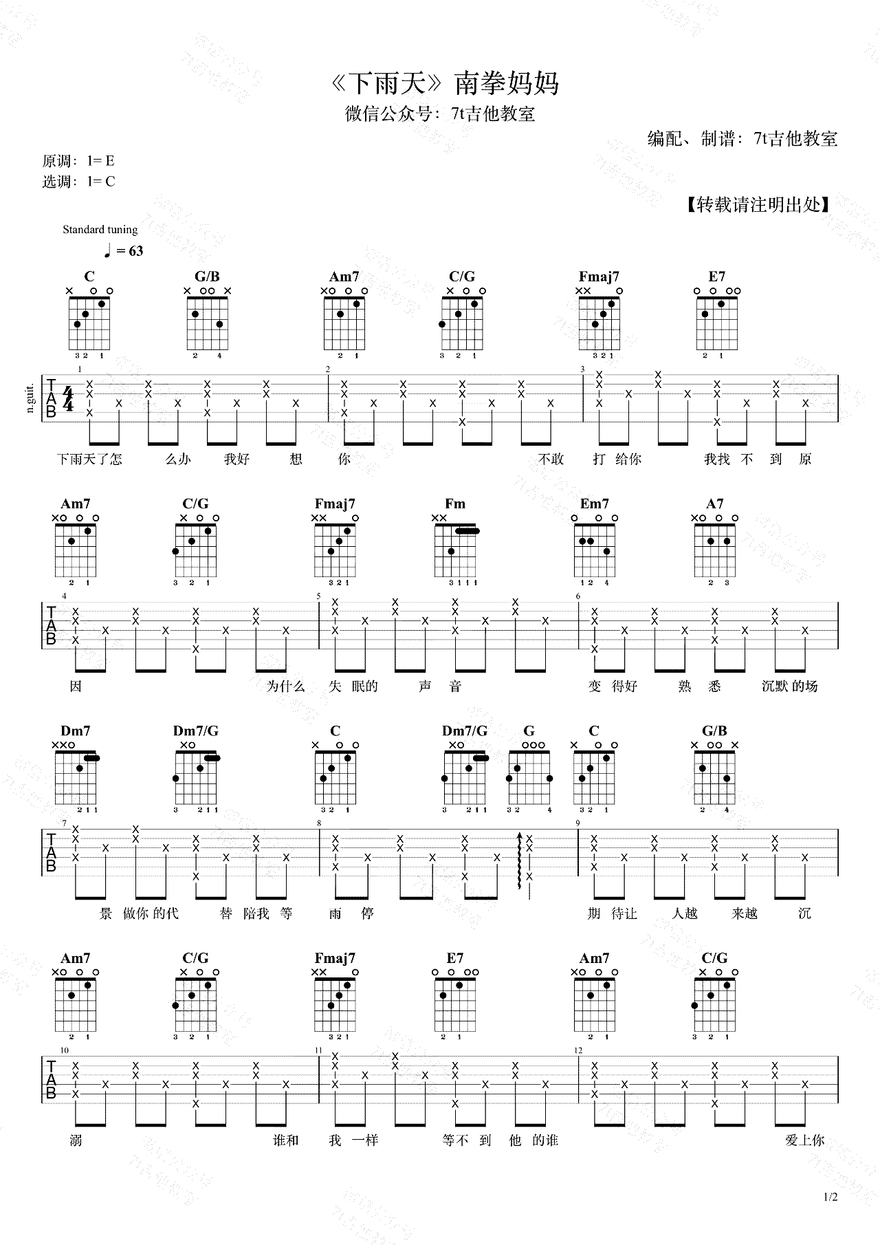 曲谱介绍: 《下雨天》,南拳妈妈的一首经典代表歌曲,下雨天六线谱,这首歌的原调是E大调,简单版谱子用的是C大调的指法来编配,演示视频里是标准音调弦,变调夹夹在第3品。7T吉他教室编配出品,琴谱网网更新分享。 本期带来《下雨天》的女生版本,演示:蜜汁叉烧肠。音域比较高的男生也可以用这个谱子,男生建议不用变调夹。