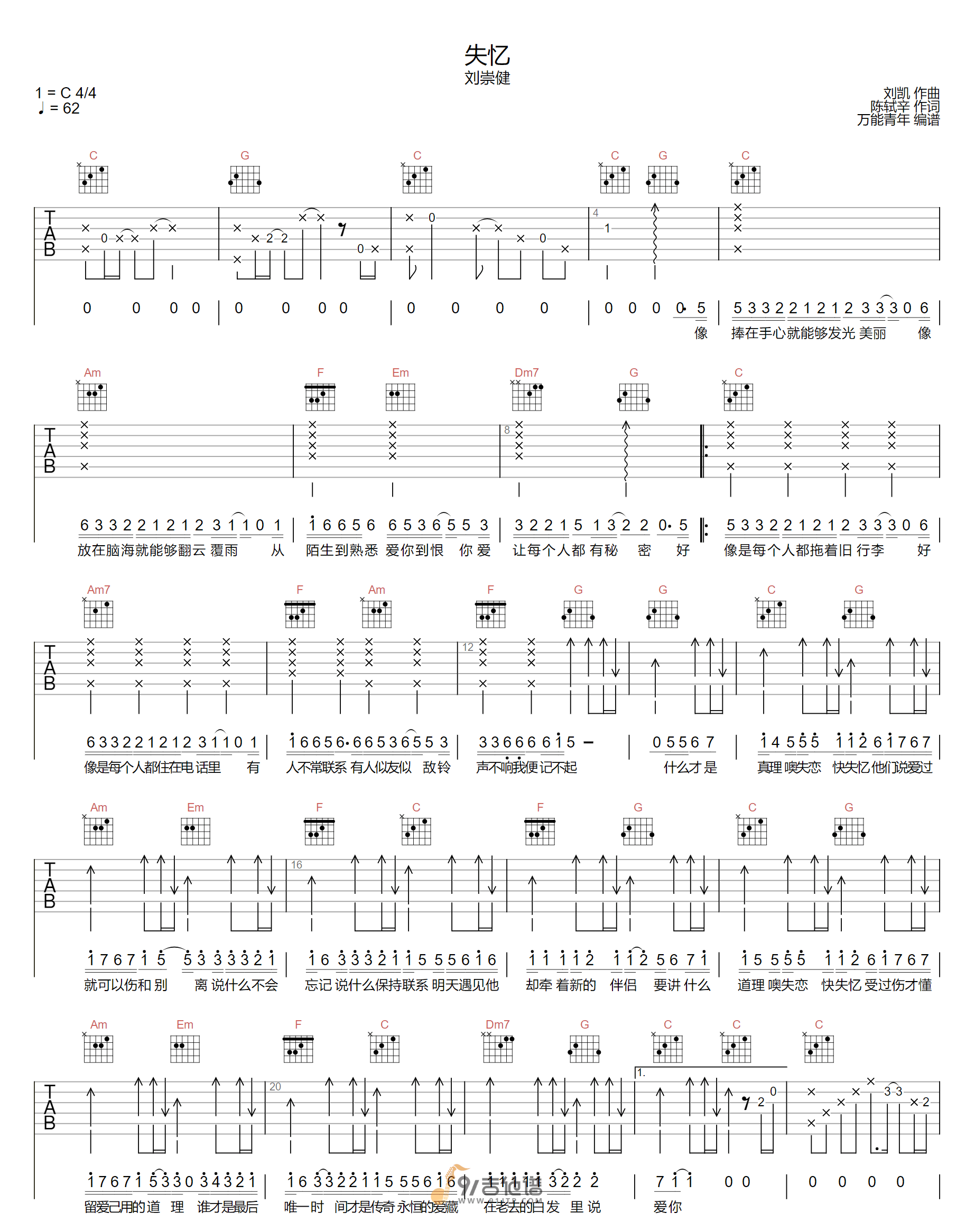 失忆吉他谱 - 刘崇健 - C调吉他弹唱谱 - 原版
