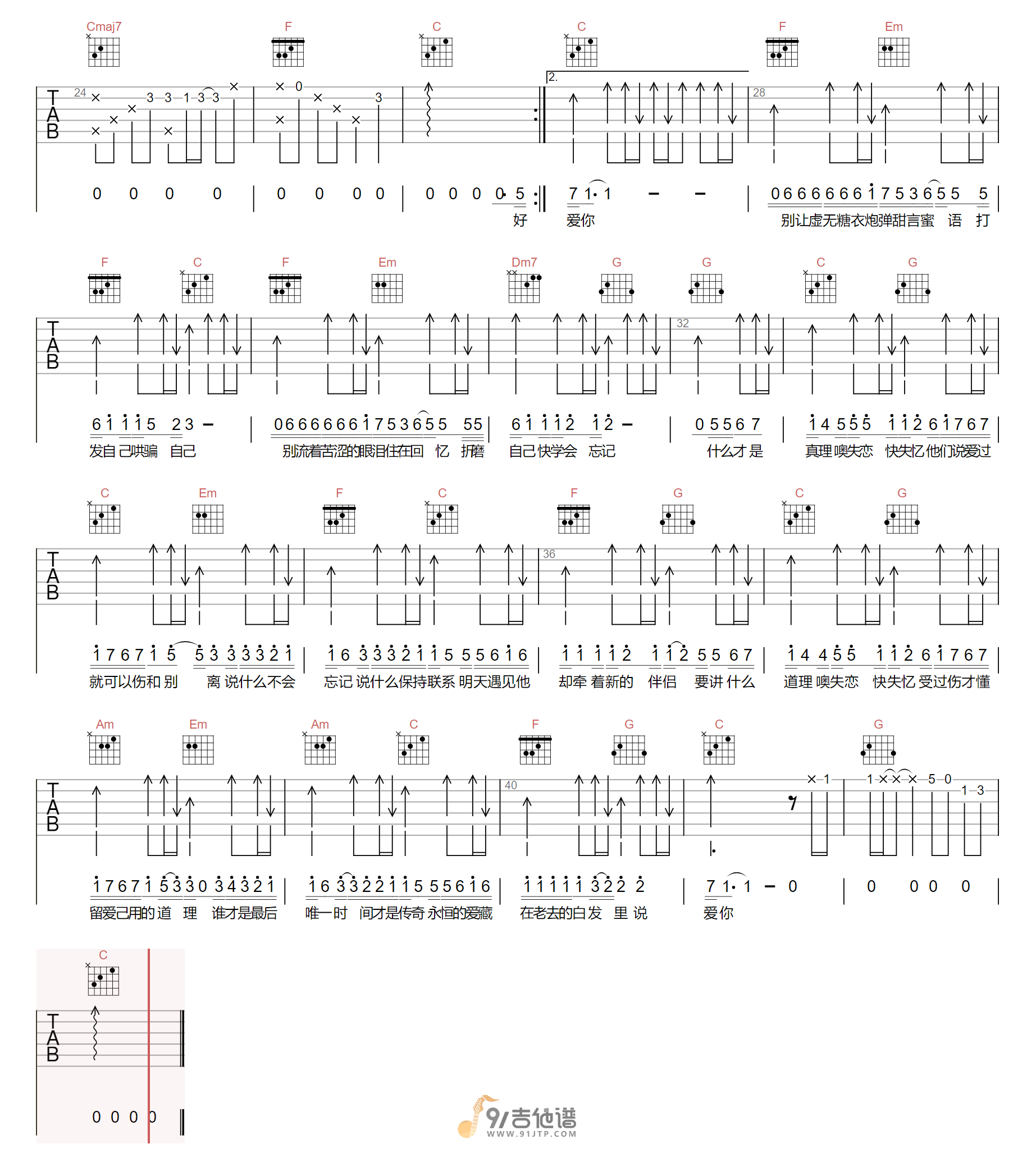 曲谱介绍: 曲谱简介:失忆吉他谱,刘崇健演唱的一首歌曲,4/4拍的节奏,这首歌曲的原调为C调,这里曲谱采用了C调指法进行编配,演唱时可不夹变调夹,曲谱由万能青年编配出品。刘崇建是乐坛中嗓音质感和音色均十分有个人特色的一位歌手。同时,他的舞台表现力,演唱时的感染力也不容小觑。
