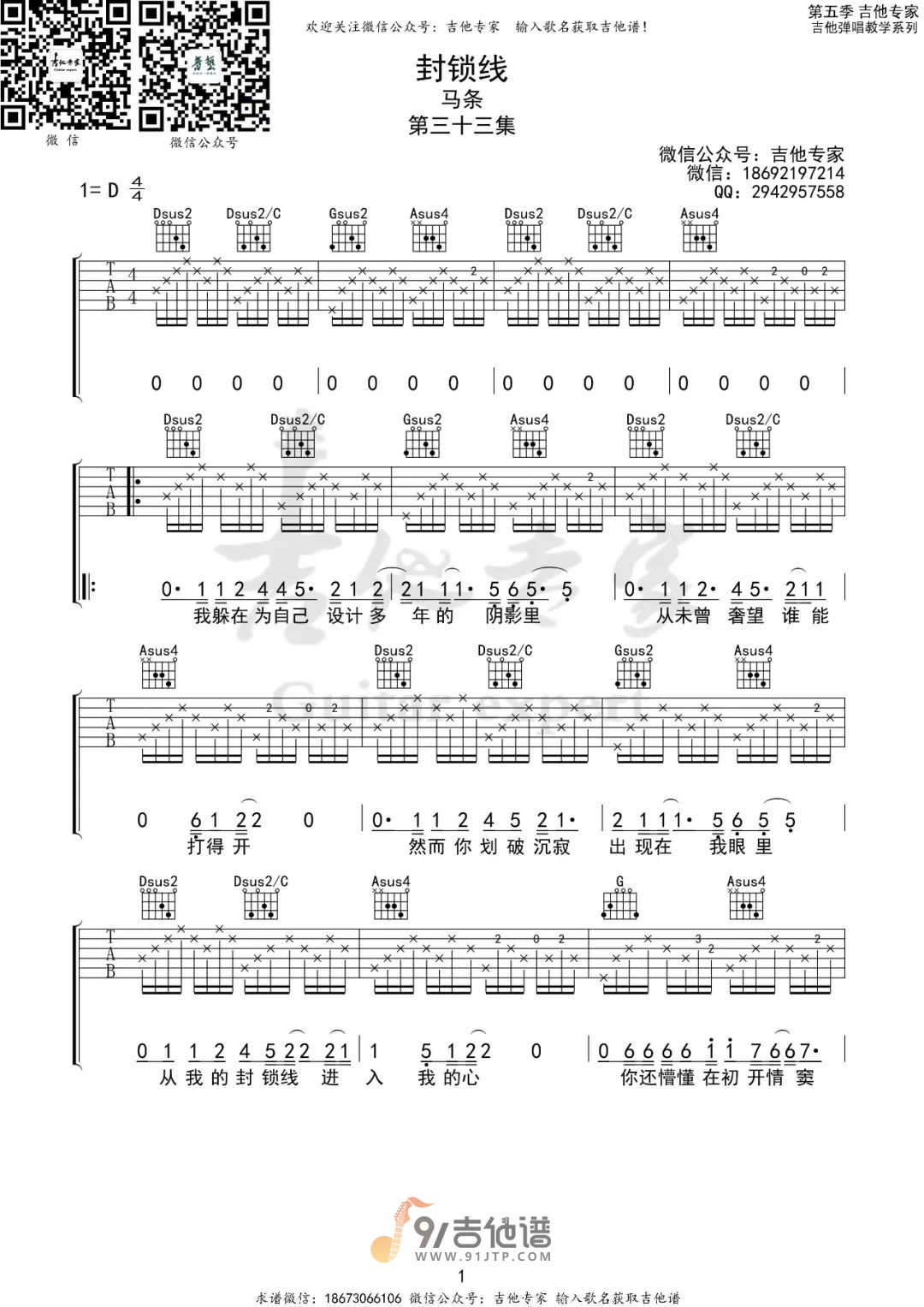曲谱介绍: 曲谱简介:封锁线吉他谱,马条演唱的一首歌曲,4/4拍的节奏,这首歌曲的原调为D调,这里曲谱采用了D调指法进行编配,演唱时可不夹变调夹,曲谱由吉他专家编配出品。这首歌可谓是一首传唱甚广的民谣金曲了,记得曾经第一次听这首歌时,看歌名“封锁线”只感觉硝烟弹雨、战火纷飞,然而打开一听,却是这么柔情入骨、悱恻缠绵。