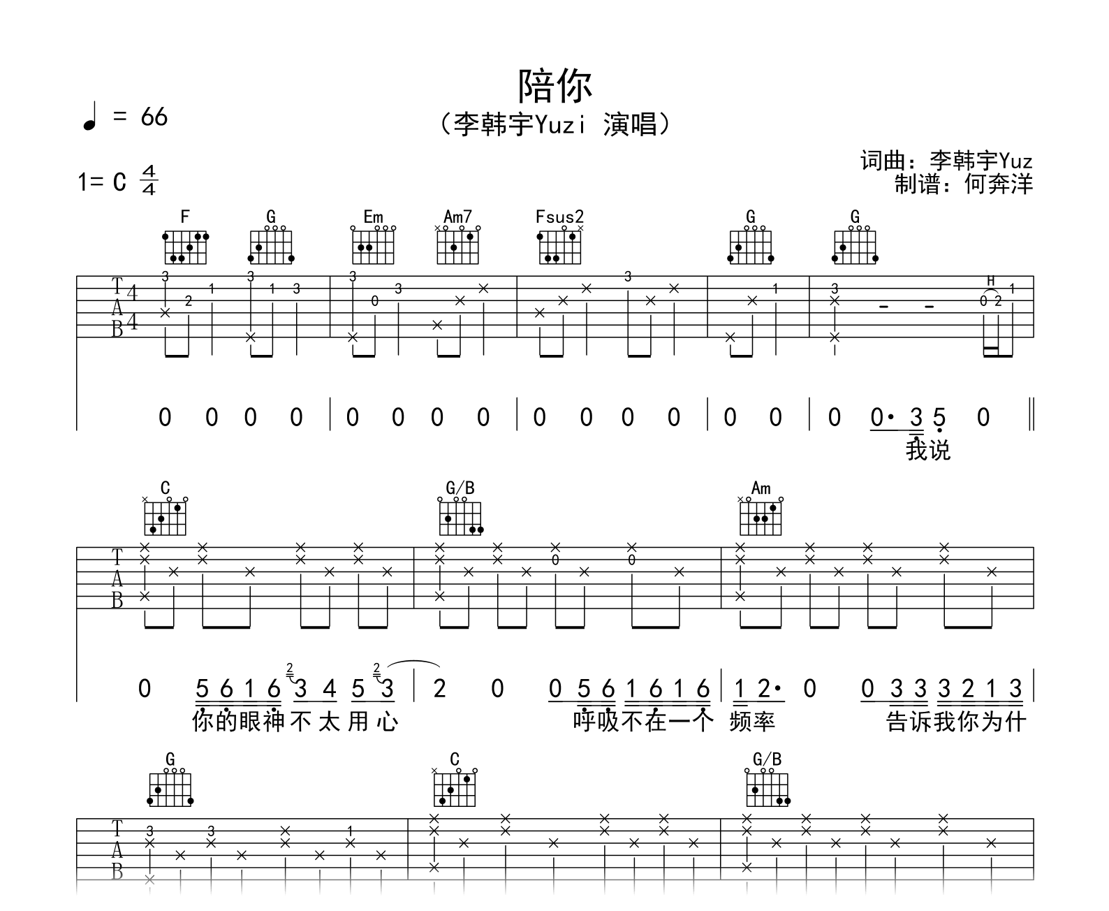 陪你吉他谱 - 李韩宇Yuzi - C调吉他弹唱谱