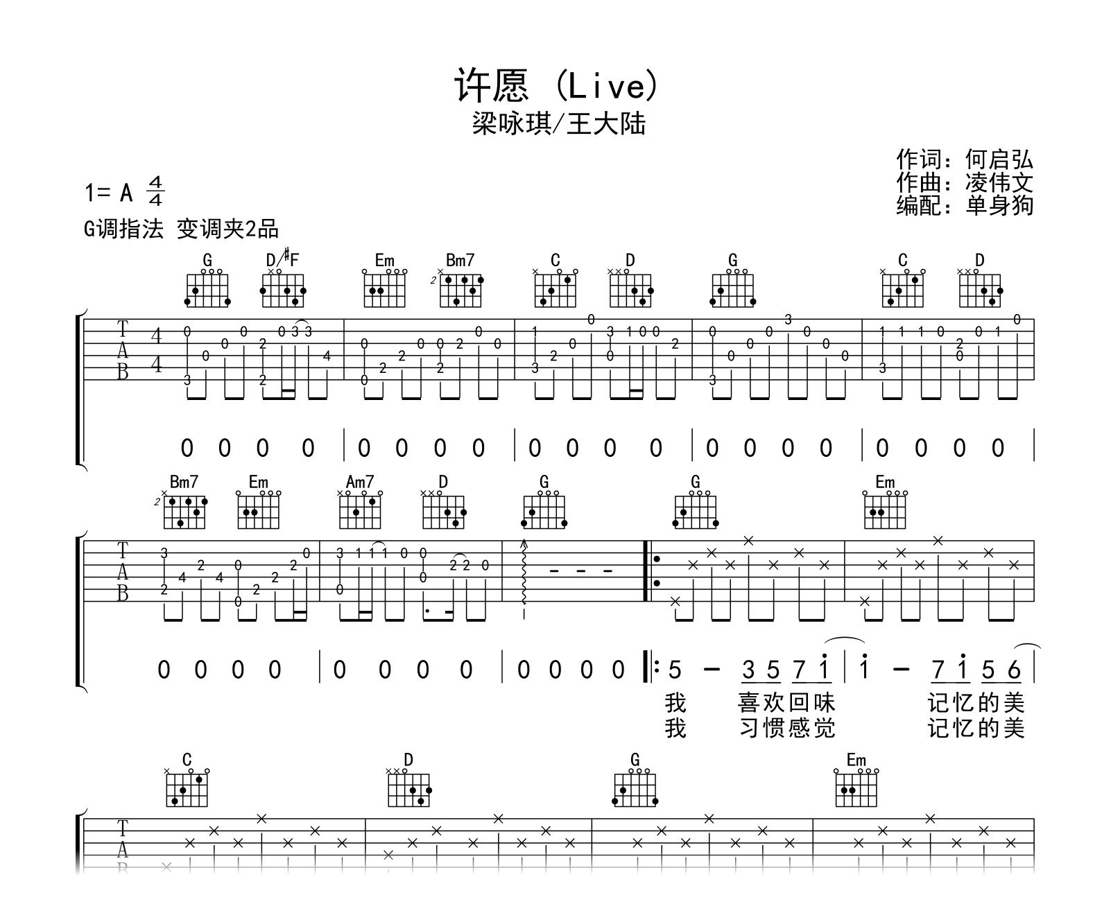 许愿吉他谱 - 梁咏琪/王大陆 - G调吉他弹唱谱