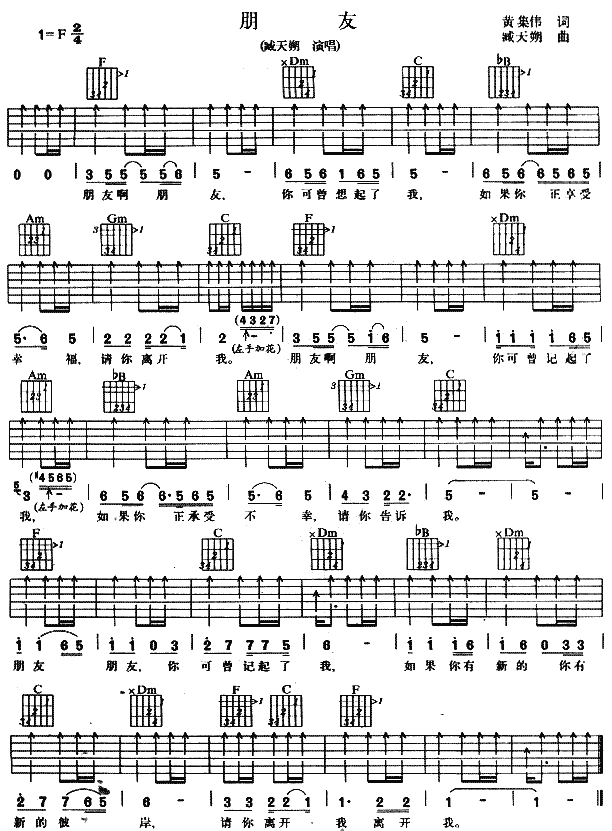 曲谱介绍: 《朋友》吉他弹唱谱,共有1张高清图谱,免翻页排版设计。