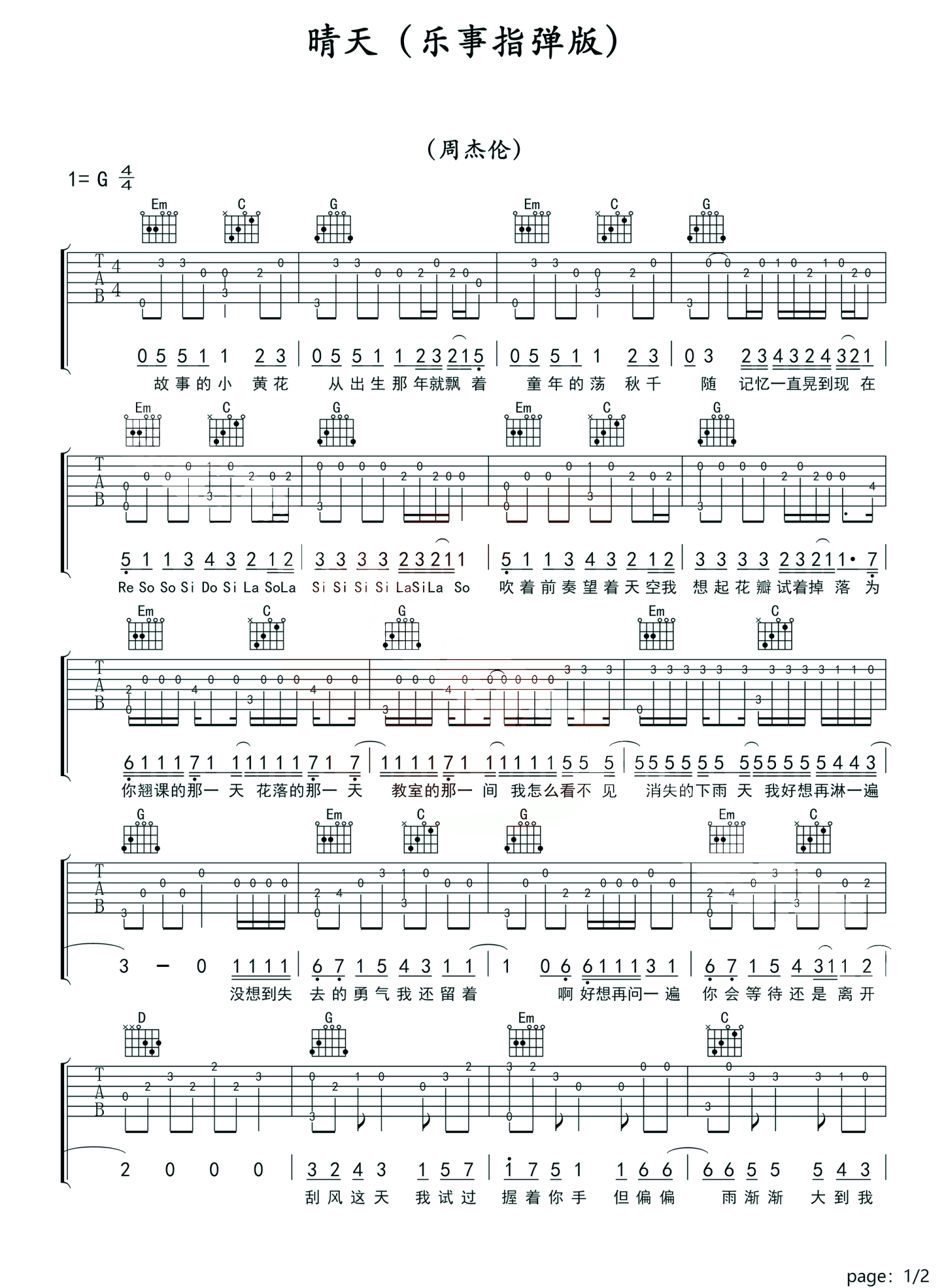 晴天吉他谱 - 周杰伦 - G调吉他独奏谱 - 简单版