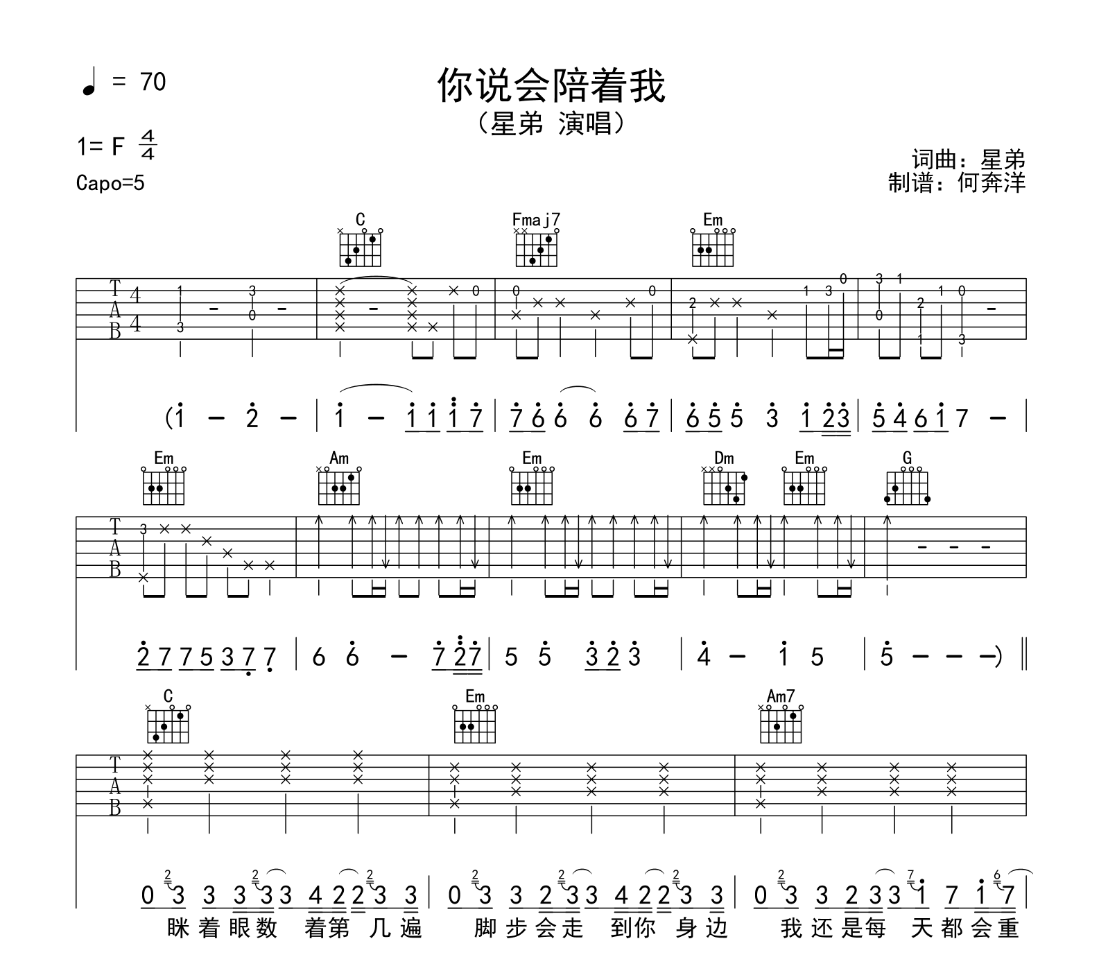 曲谱介绍: 你说你会陪着我吉他谱,星弟演唱的一首网络热门歌曲,《你说你会陪着我》吉他弹唱谱,原调F,选用C调和弦指法编配,capo五品,完整六线谱共三张高清图片谱。