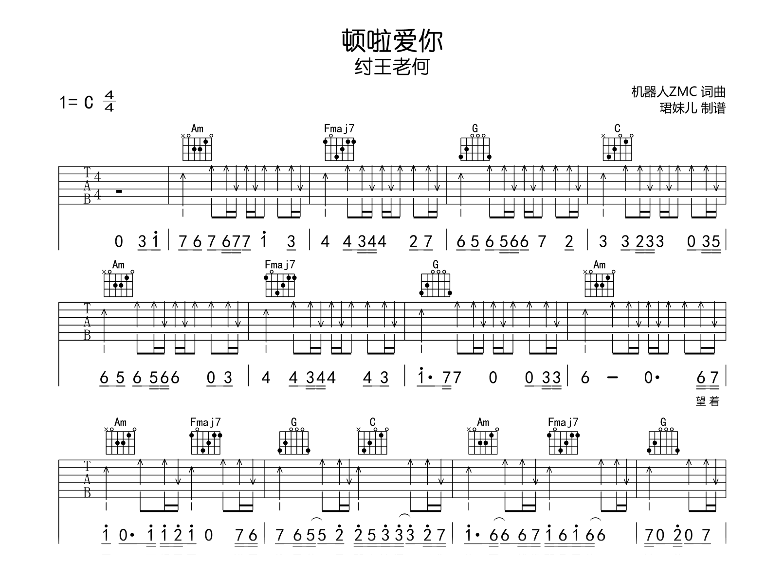 顿啦爱你吉他谱 - 纣王老何 - C调吉他弹唱谱