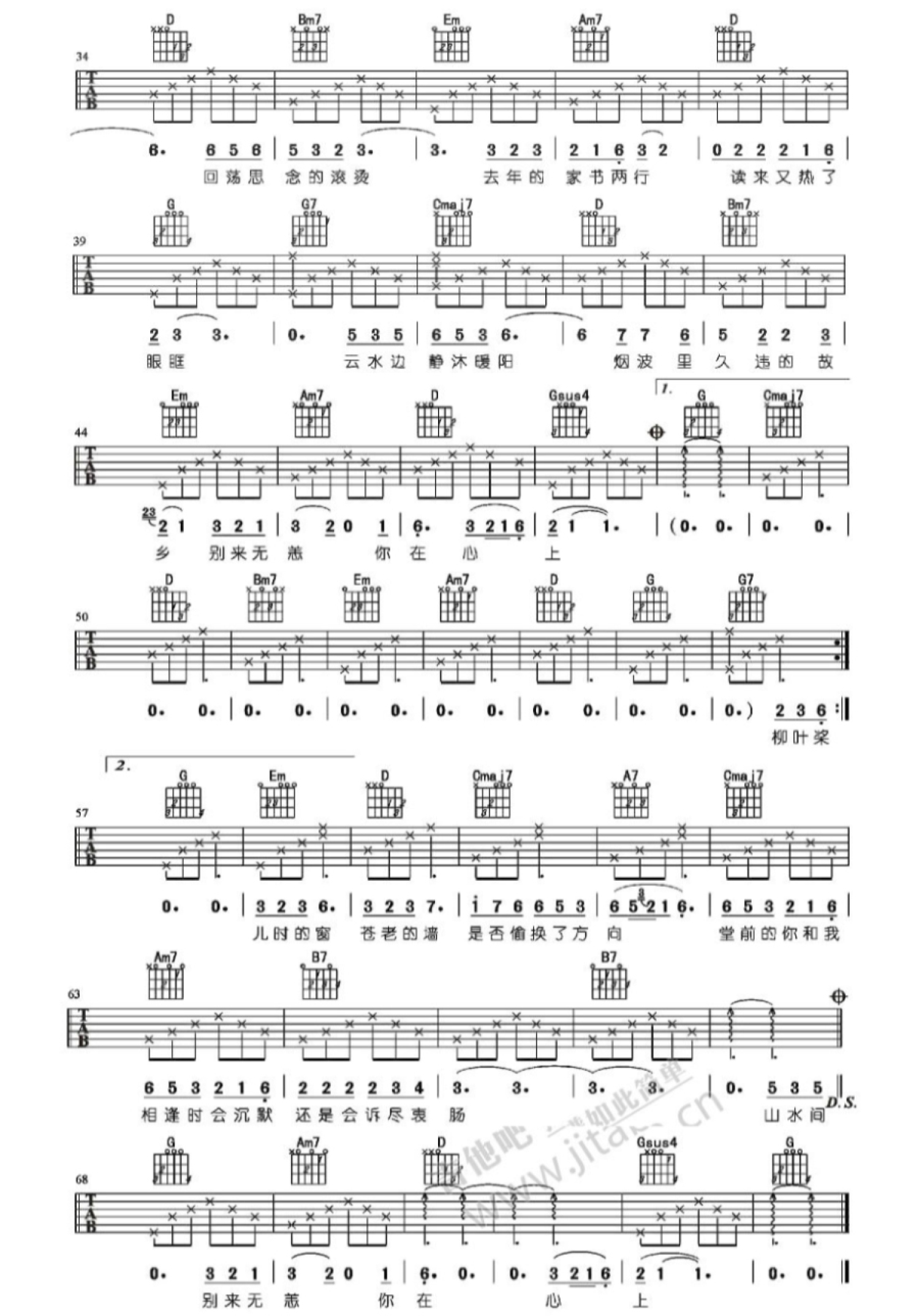 曲谱介绍: 变调夹夹第四品。燕归巢吉他六线谱,一首舒缓优美的中国风歌曲,获得最受欢迎男女对唱金曲奖,很有一种韵味,在年末春节听唱也很应景。希望你们回家路上,一路顺风。