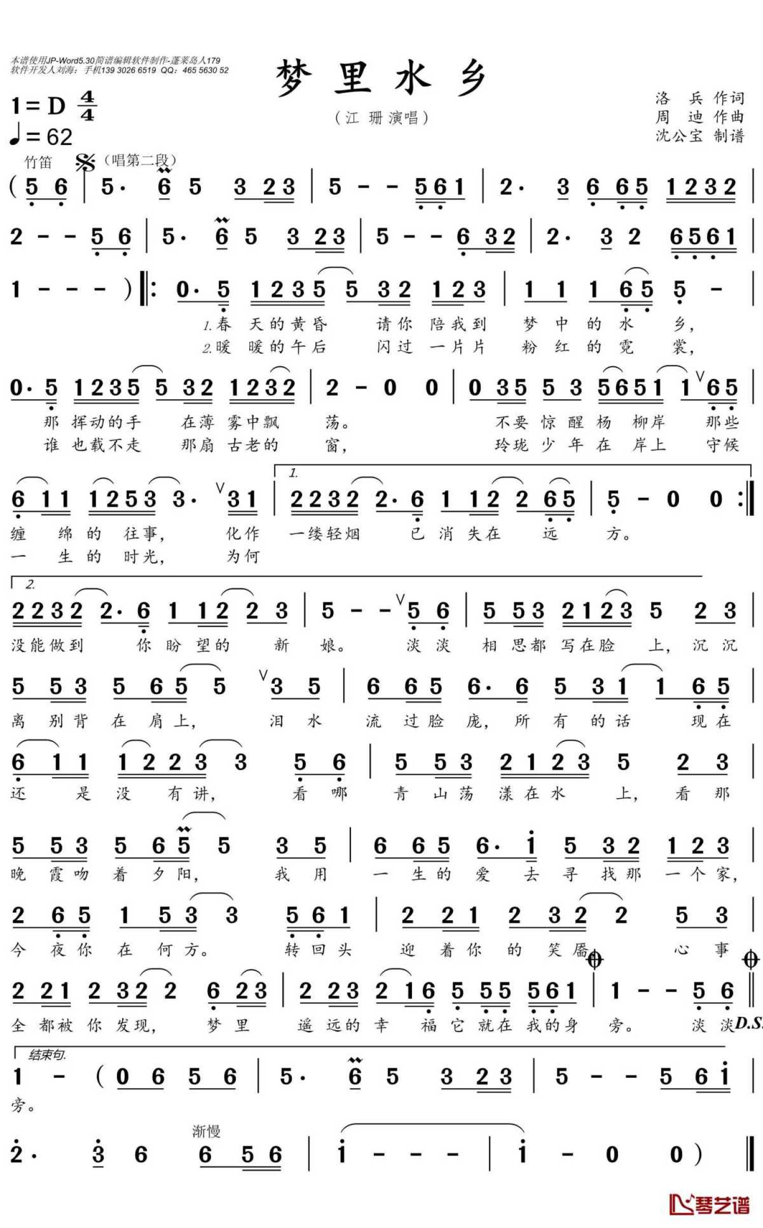 曲谱介绍: 江珊《梦里水乡》歌词_简谱