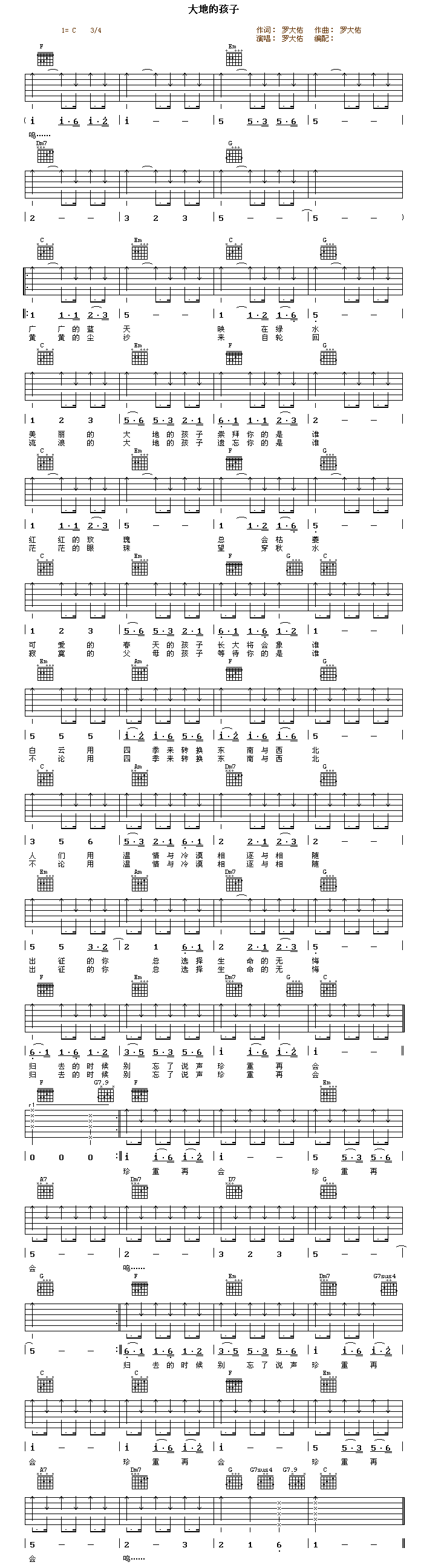 曲谱介绍: 《大地的孩子》吉他弹唱谱,共有1张高清图谱,免翻页排版设计。