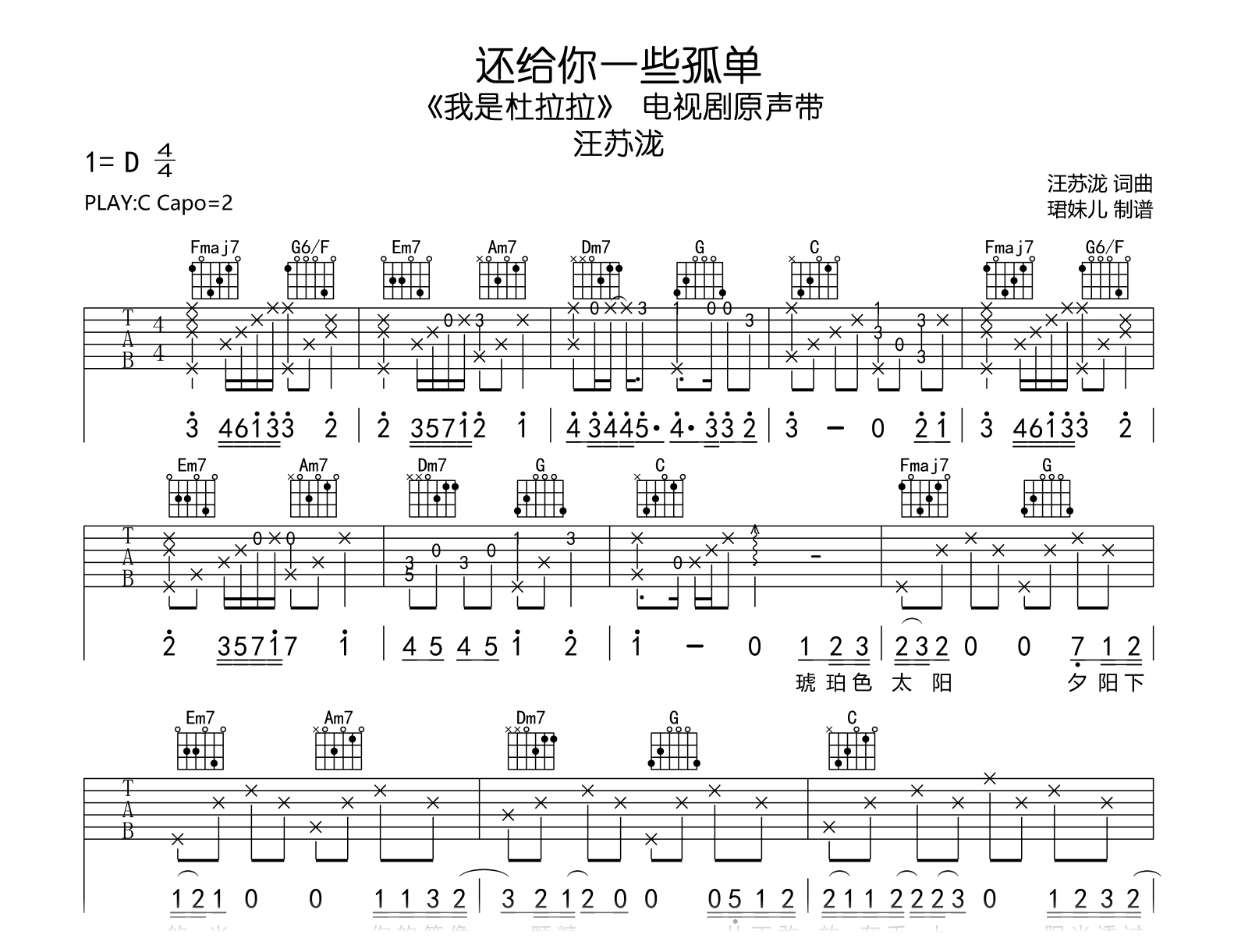 曲谱介绍: 还给你一些孤单吉他谱,汪苏泷演唱,电视剧《我是杜拉拉》主题曲,《还给你一些孤单》吉他弹唱谱,原调D,选用C调指法编配,建议变调夹2品,速度85BPM,演奏易上手难度较简单。 舒缓的旋律、动人的歌词,搭配温暖的嗓音和深情的演唱,缓缓地诉说着回忆,将孤单的伤感之情娓娓道来。