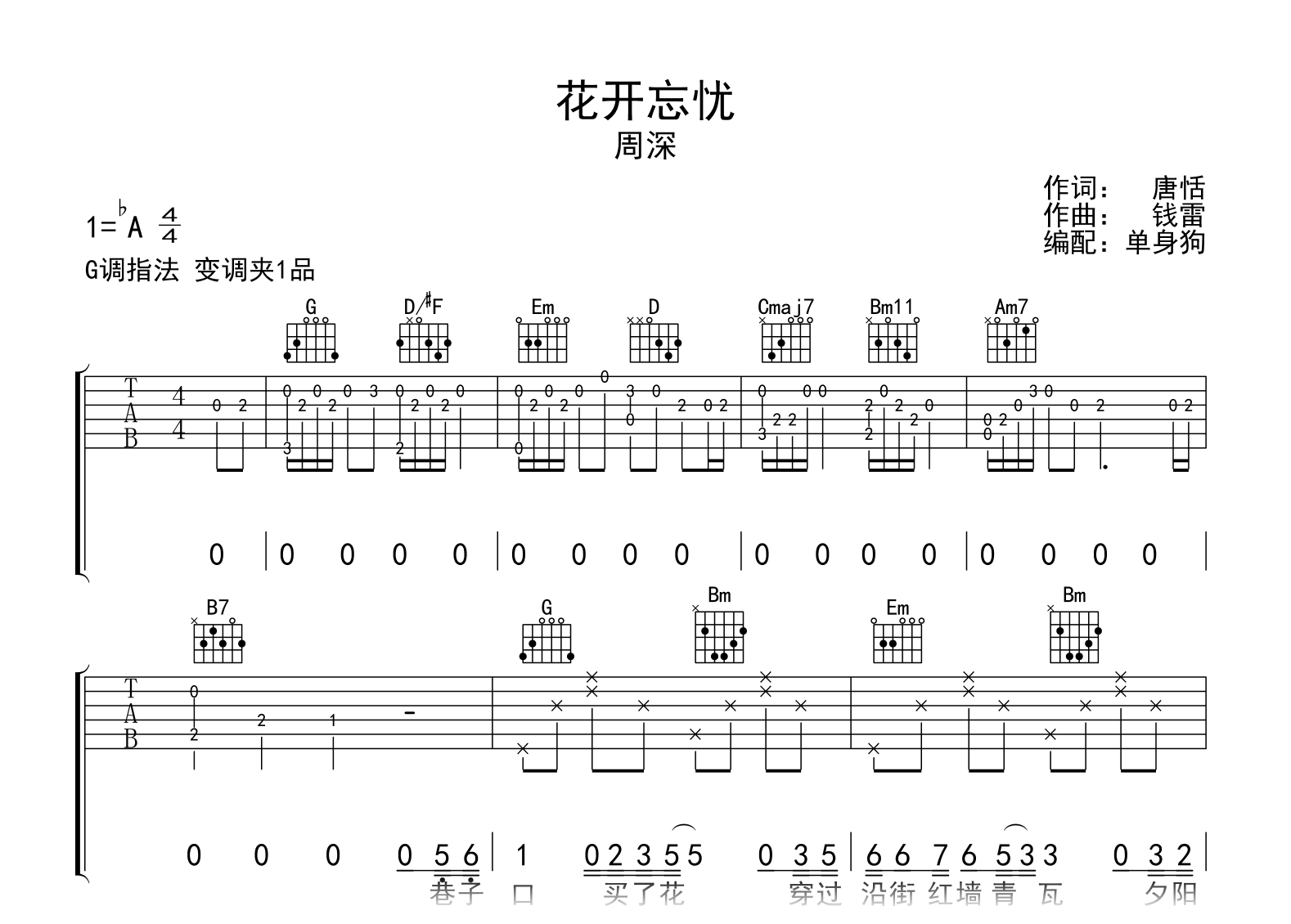 曲谱介绍: 花开忘忧吉他谱,周深演唱,花会开,忧愁会消散,我们一起向前走! ​《花开忘忧》吉他六线谱,原调bA,选用G调指法,变调夹夹一品,完整版本共四张高清图片六线谱。 这是给你的花,花的名字叫忘忧草。除夕夜的春晚一曲《花开忘忧》,一生的爱恋与遗憾被浓缩在短短几分钟的歌声中,清澈的声线打动了亿万观众的心。