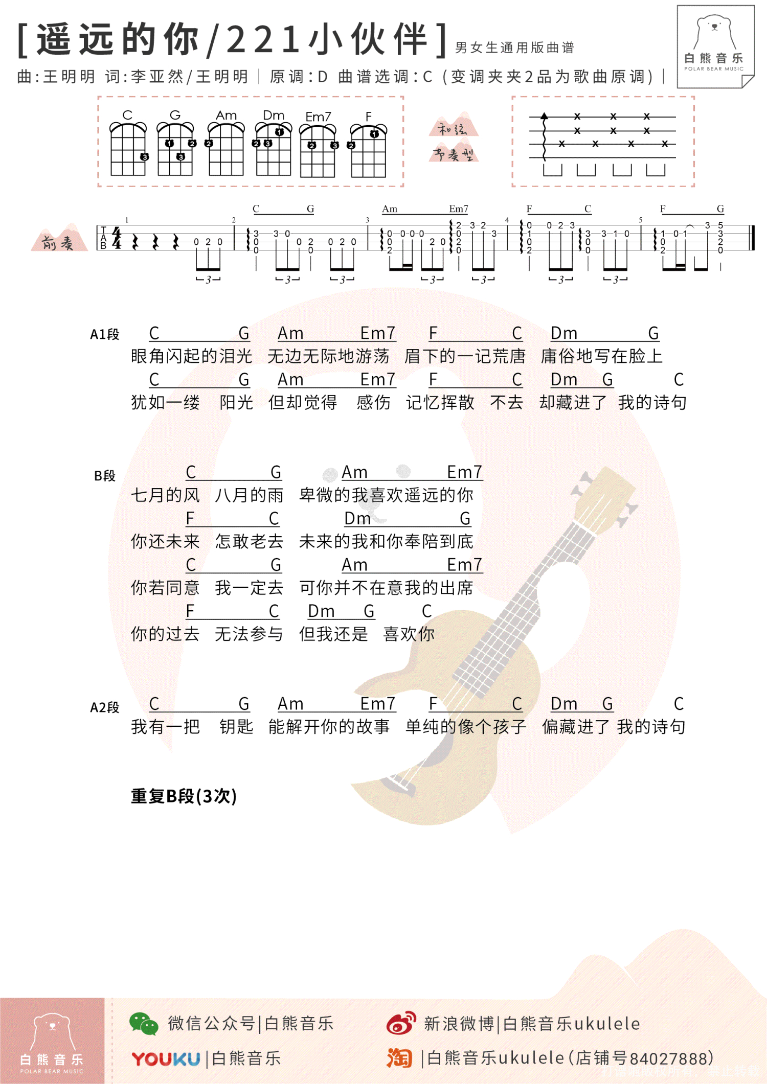 曲谱介绍: 男女生通用曲谱,原调D,选调C,变调夹夹二品为原调。遥远的你尤克里里谱,高清图片谱