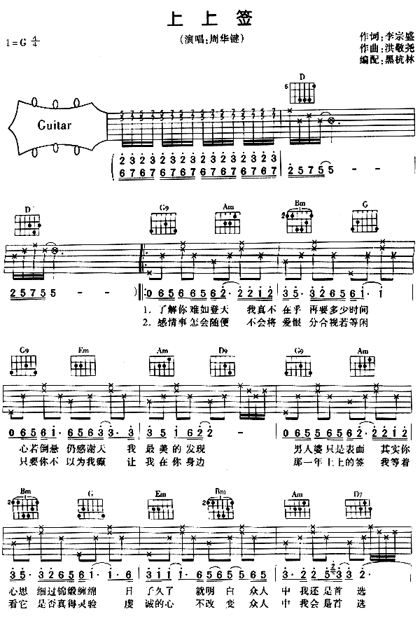 曲谱介绍: 《上上签》吉他弹唱谱,共有3张高清图谱。