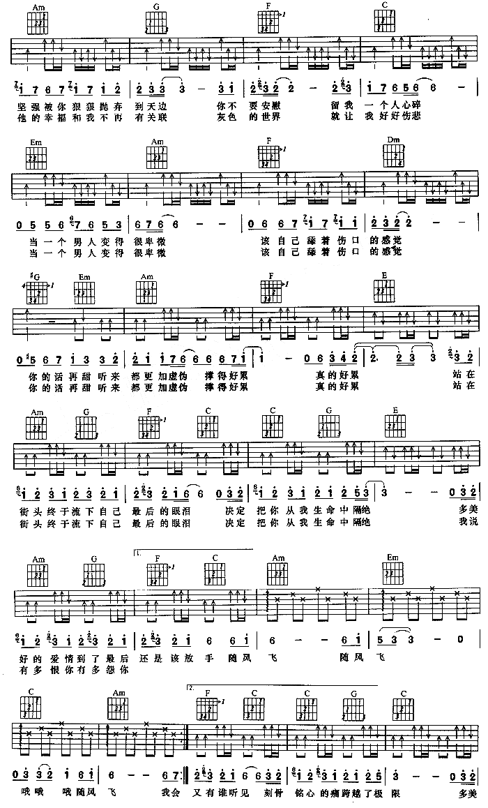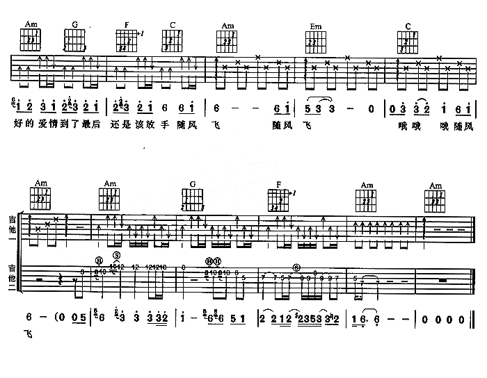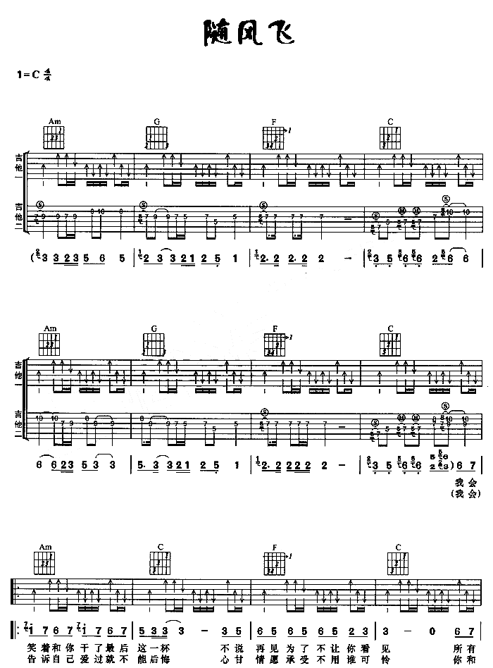 曲谱介绍: 《随风飞》吉他弹唱谱,共有3张高清图谱。