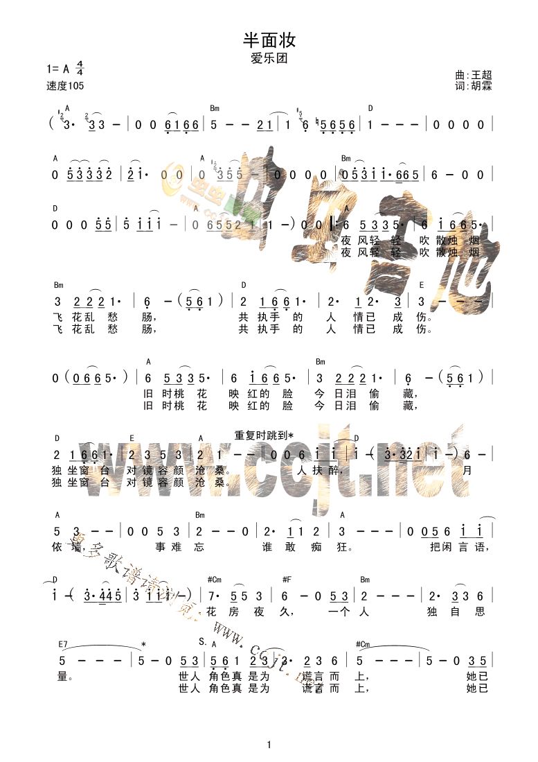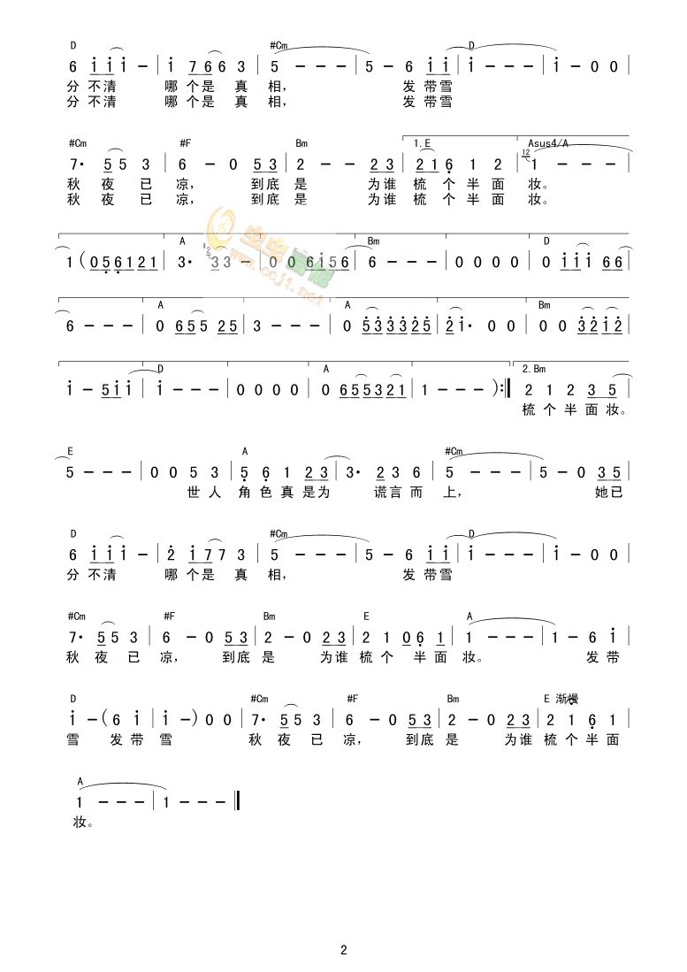曲谱介绍: 《半面妆》吉他弹唱谱,共有2张高清图谱,免翻页排版设计。