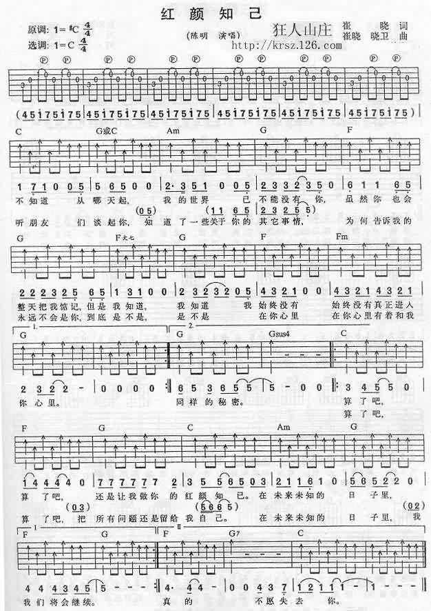 曲谱介绍: 《红颜知已》吉他弹唱谱,共有1张高清图谱,免翻页排版设计。