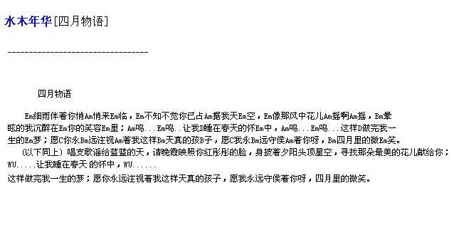 曲谱介绍: 《四月物语》吉他弹唱谱,共有1张高清图谱,免翻页排版设计。