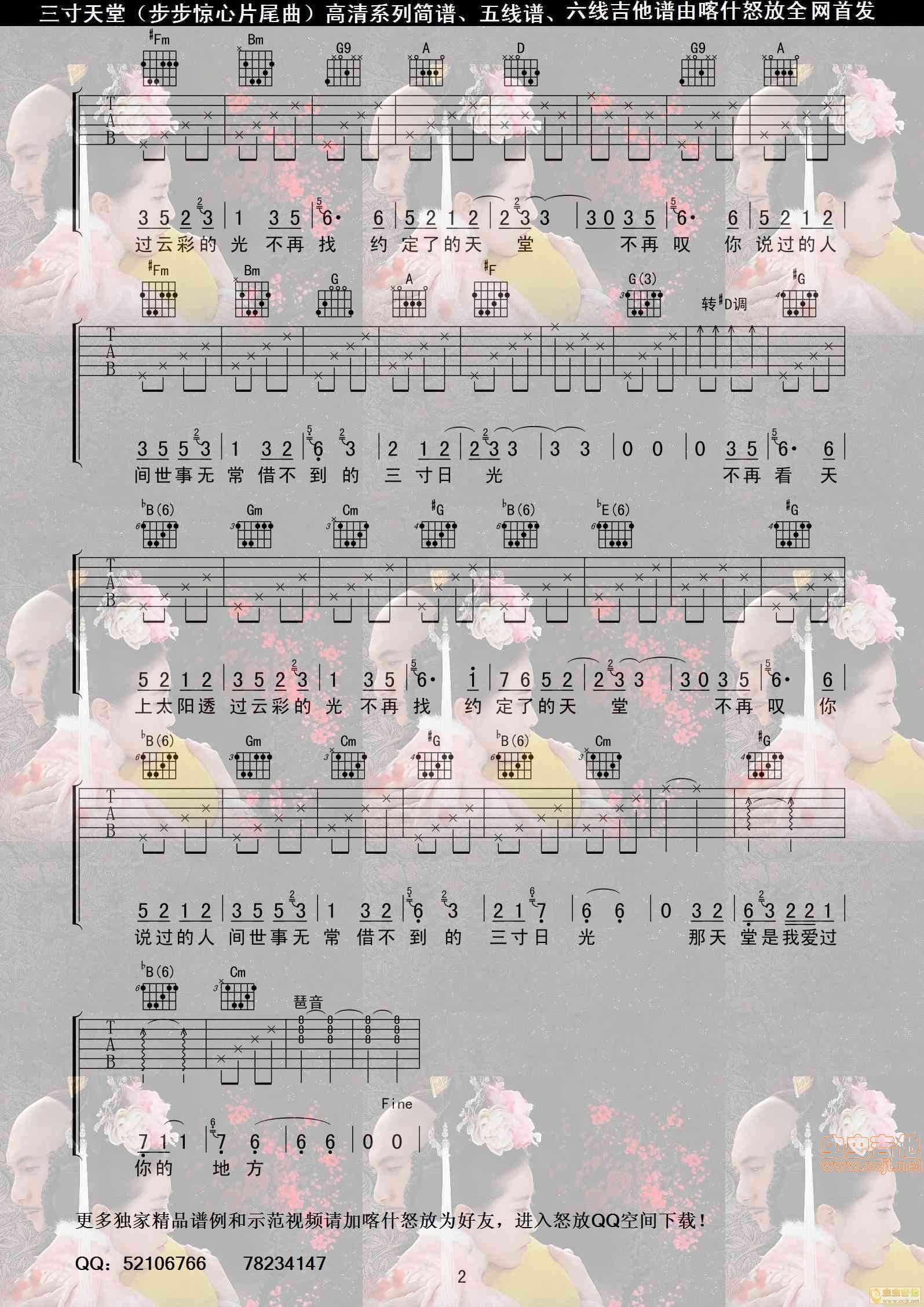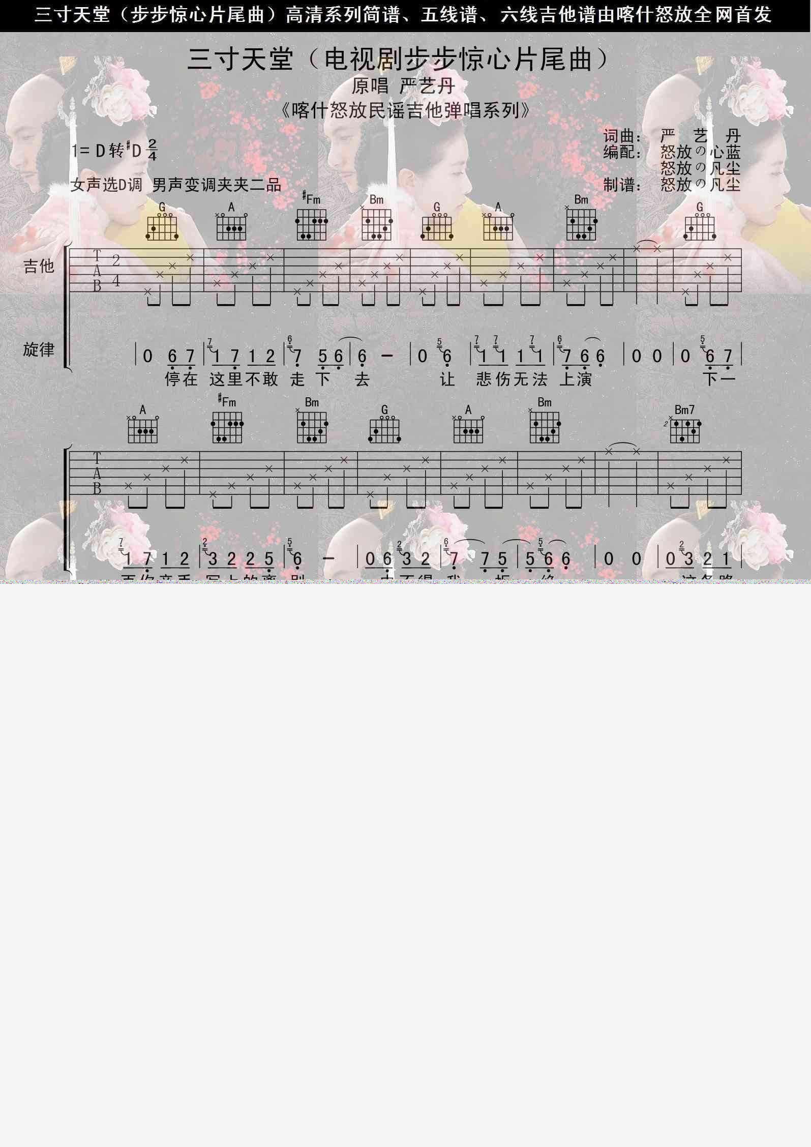 曲谱介绍: 步步惊心《三寸天堂》吉他弹唱谱,共有2张高清图谱,免翻页排版设计。