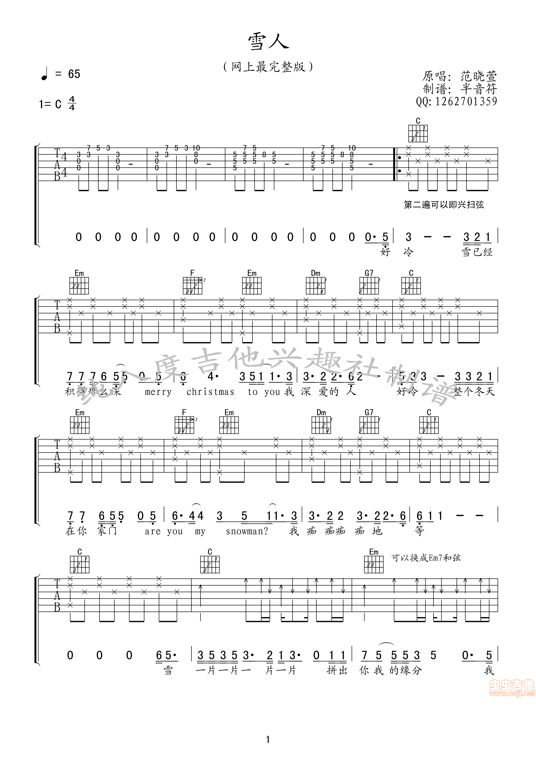 曲谱介绍: 《雪人》吉他弹唱谱,共有2张高清图谱,免翻页排版设计。