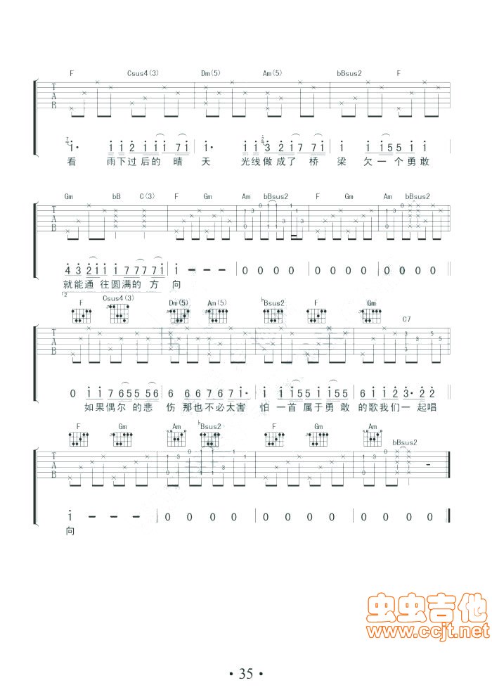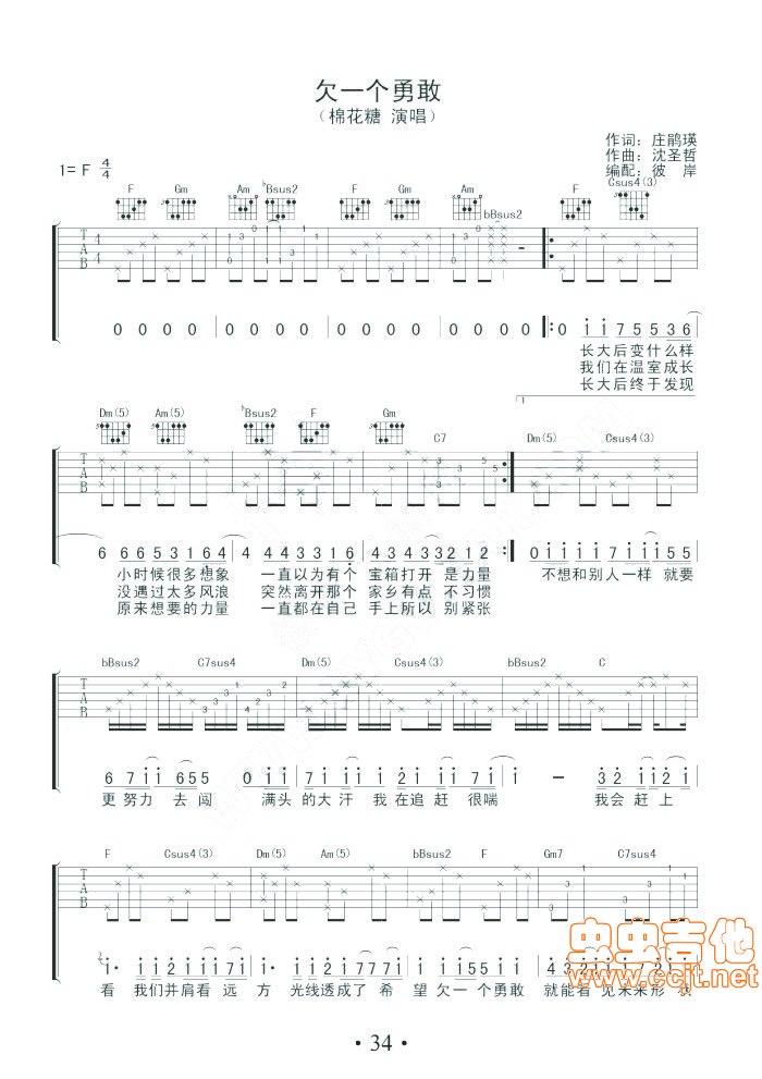 曲谱介绍: 《欠一个勇敢》吉他弹唱谱,共有2张高清图谱,免翻页排版设计。
