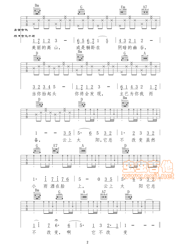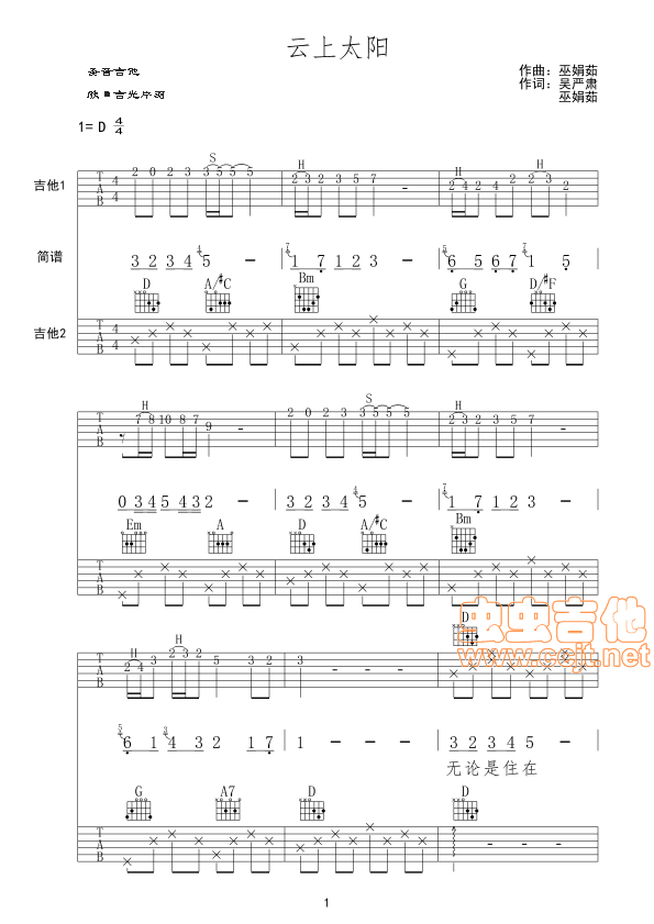 曲谱介绍: 《云上太阳》吉他弹唱谱,共有2张高清图谱,免翻页排版设计。