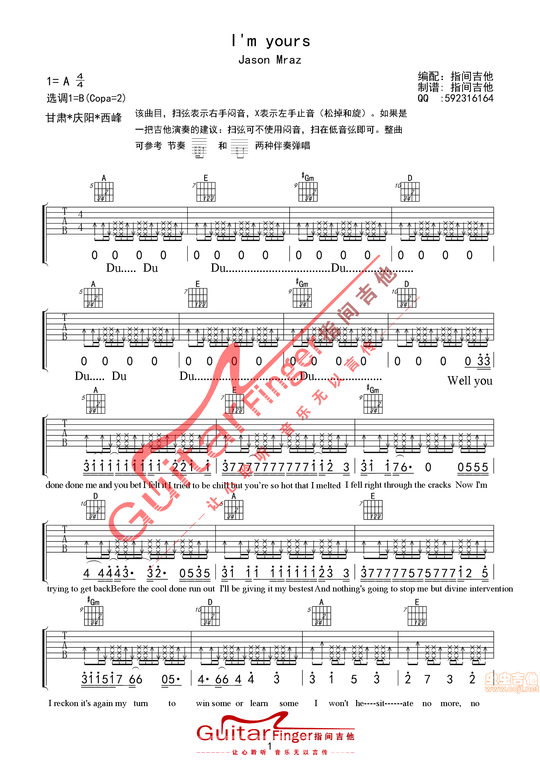 I'm yours Jason Mraz 指间吉他 高清吉他谱 - I'm - 吉他弹唱谱