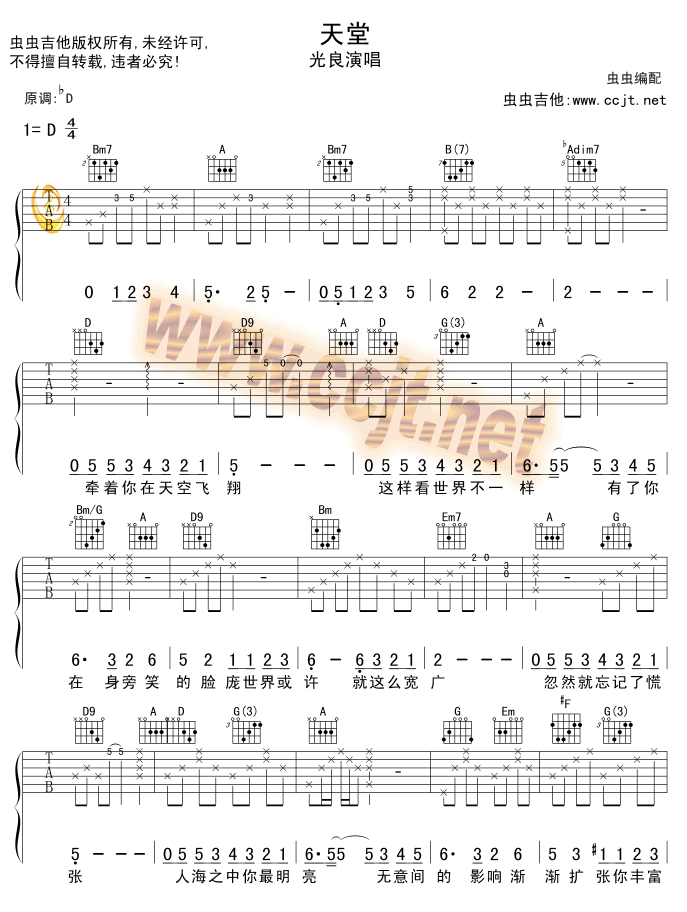 曲谱介绍: 《天堂》吉他弹唱谱,共有2张高清图谱,免翻页排版设计。