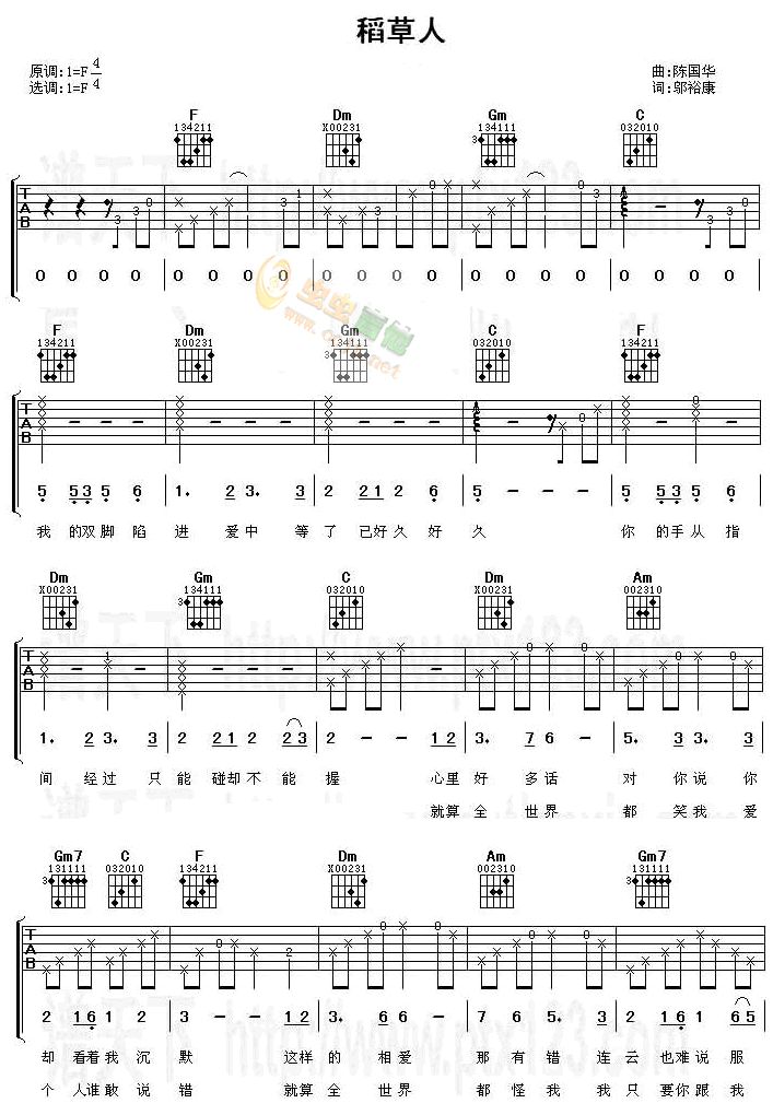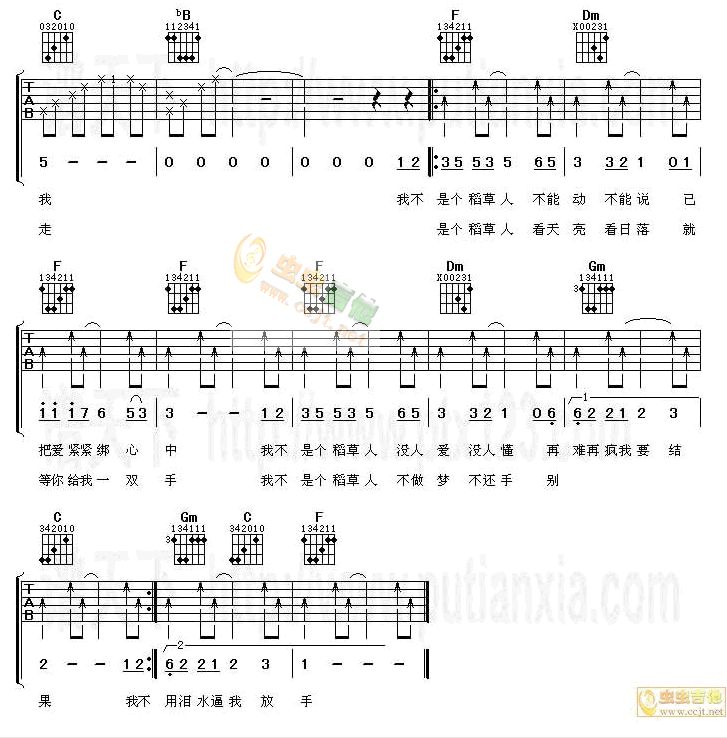 曲谱介绍: 《稻草人》吉他弹唱谱,共有2张高清图谱,免翻页排版设计。
