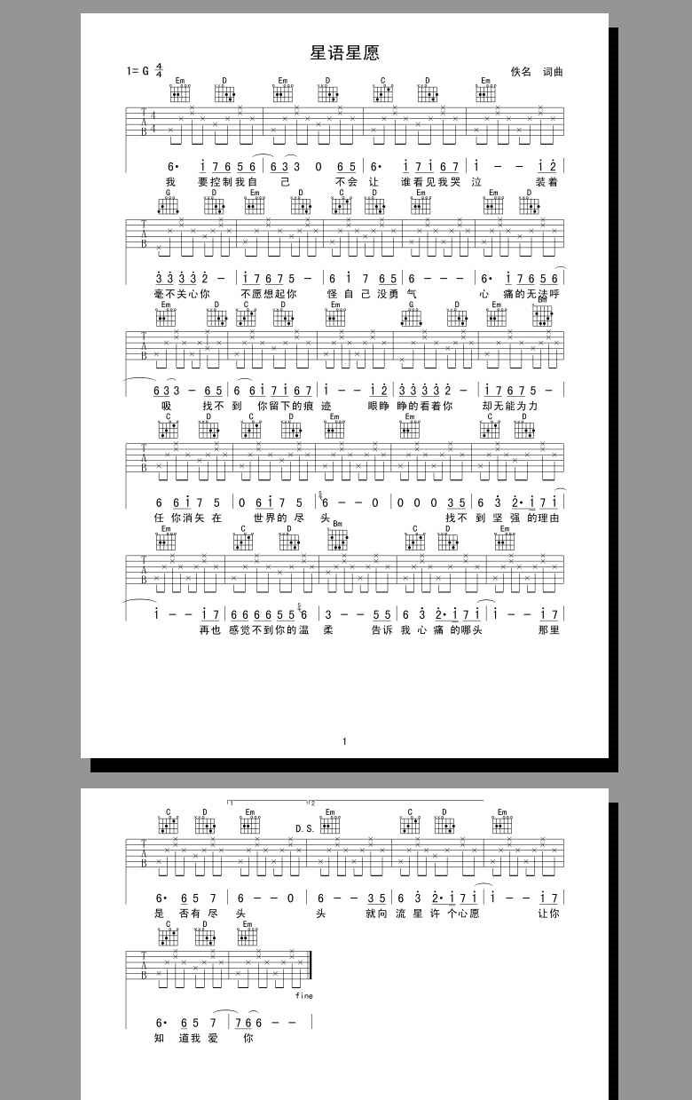 曲谱介绍: 星语心愿|《星语心愿》吉他弹唱谱,共有1张高清图谱,免翻页排版设计。