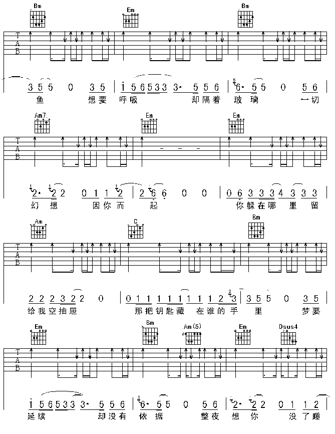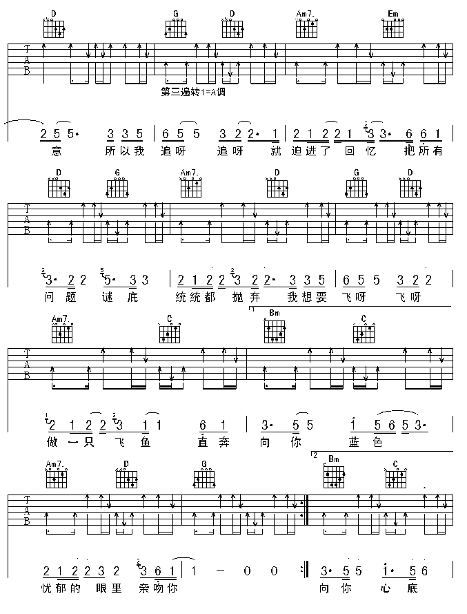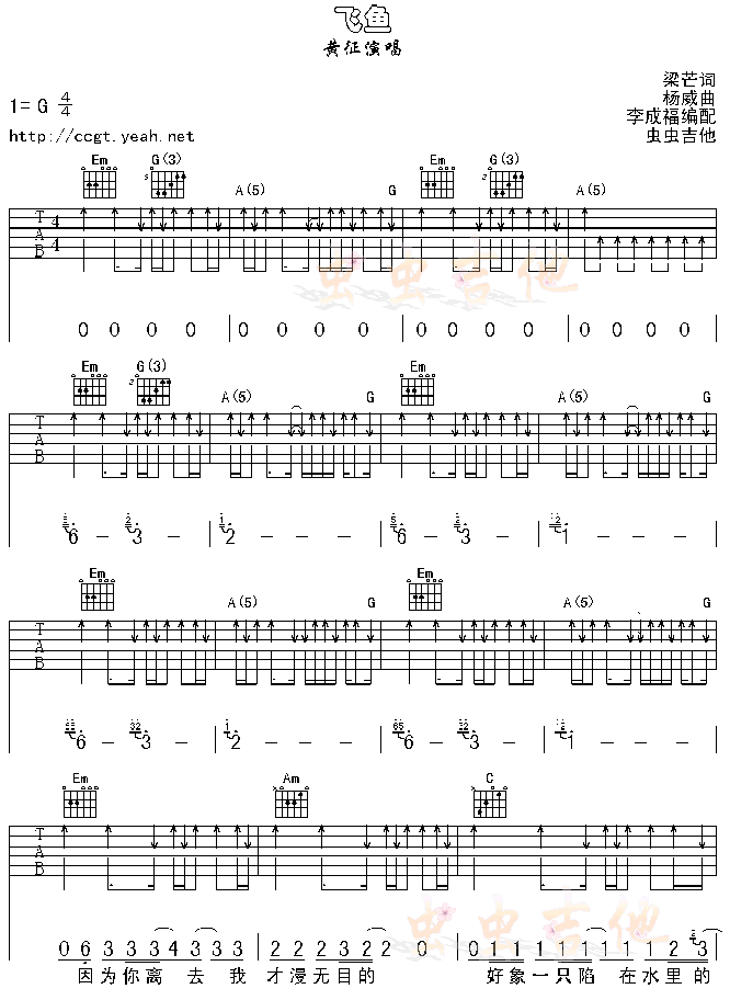 曲谱介绍: 《飞鱼》吉他弹唱谱,共有4张高清图谱。